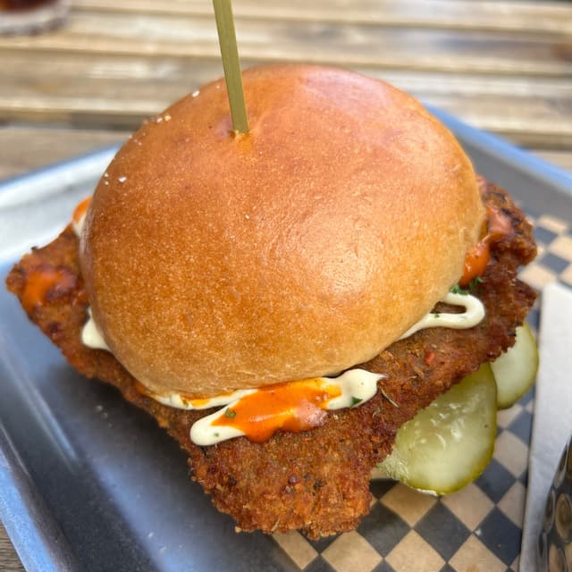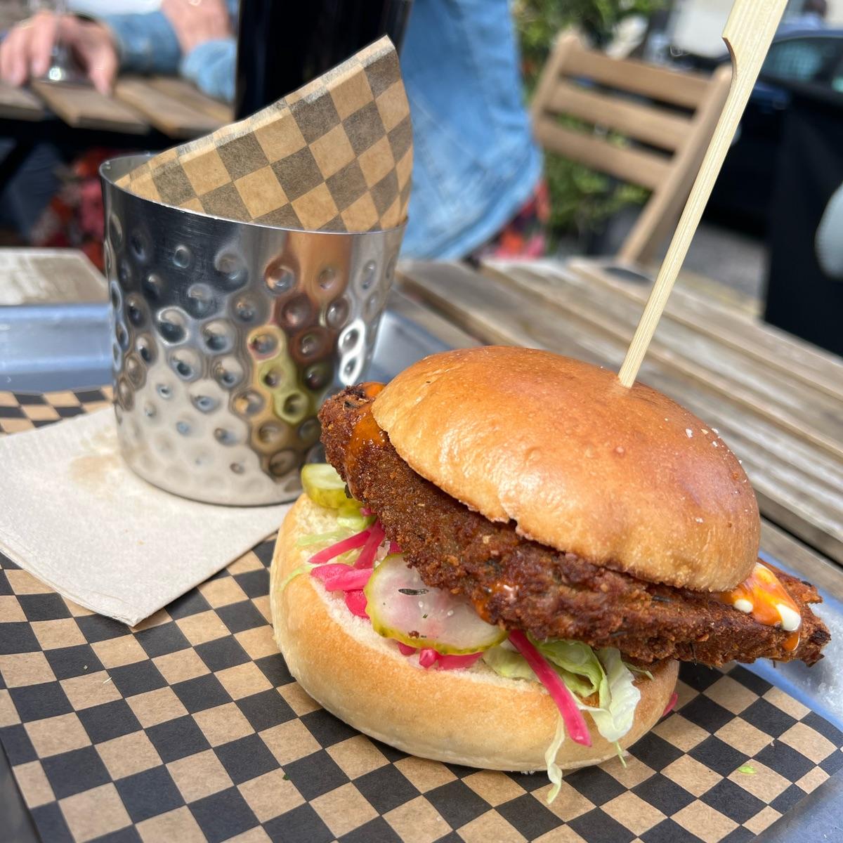 🏴 Fried ch*cken burger made of seitan and served with ranch, gherkin, pickled cabbage, lettuce, vegan buffalo sauce and fries. Heavy but heavenly delicious!