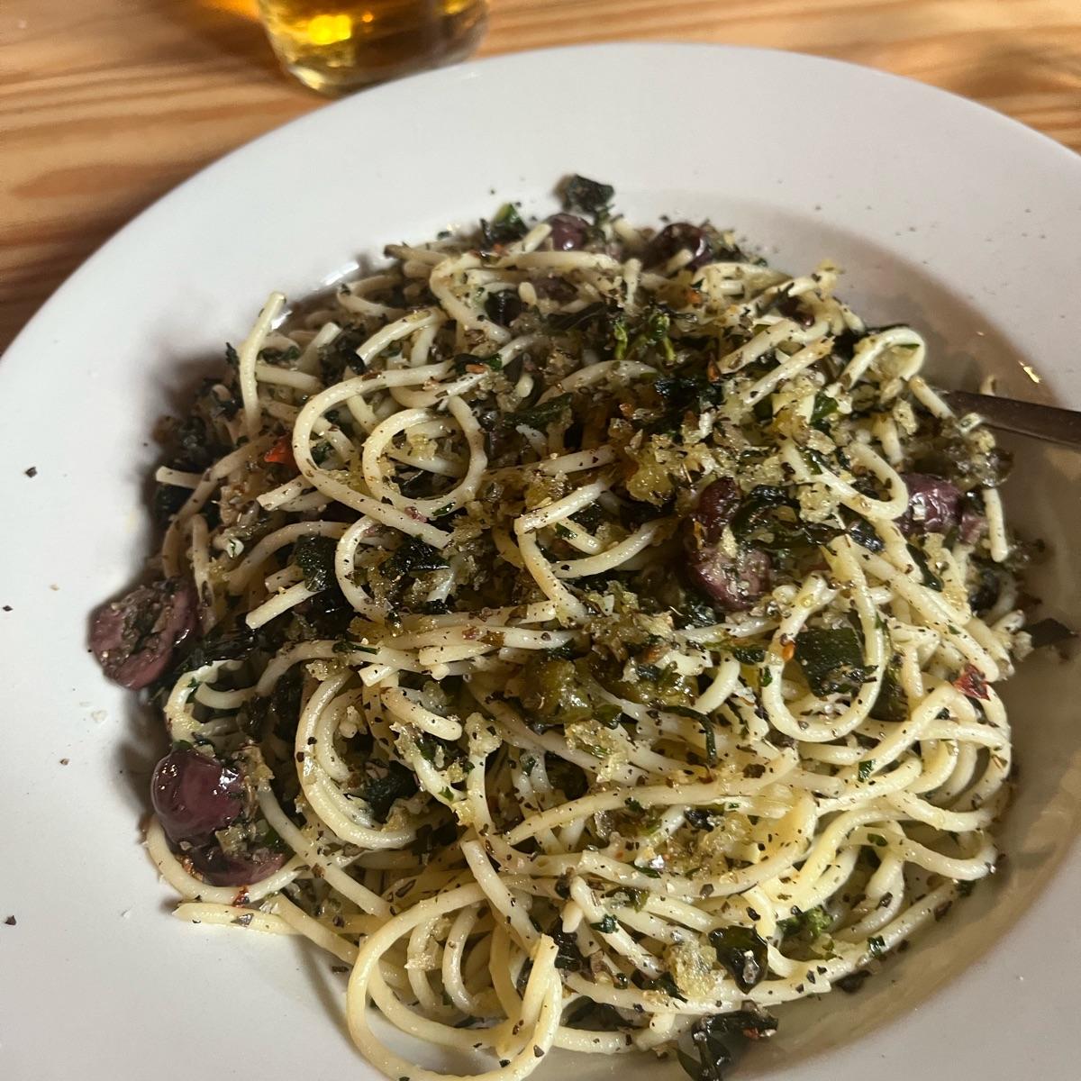 One of the most delicious pastas with parsley, oregano, olives, sage, basil, garlic, capers, spicy breadcrumbs, olive oil