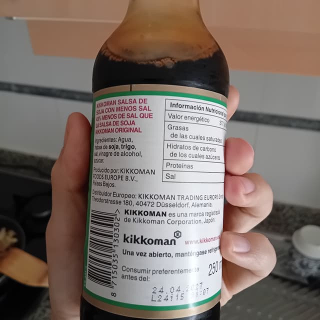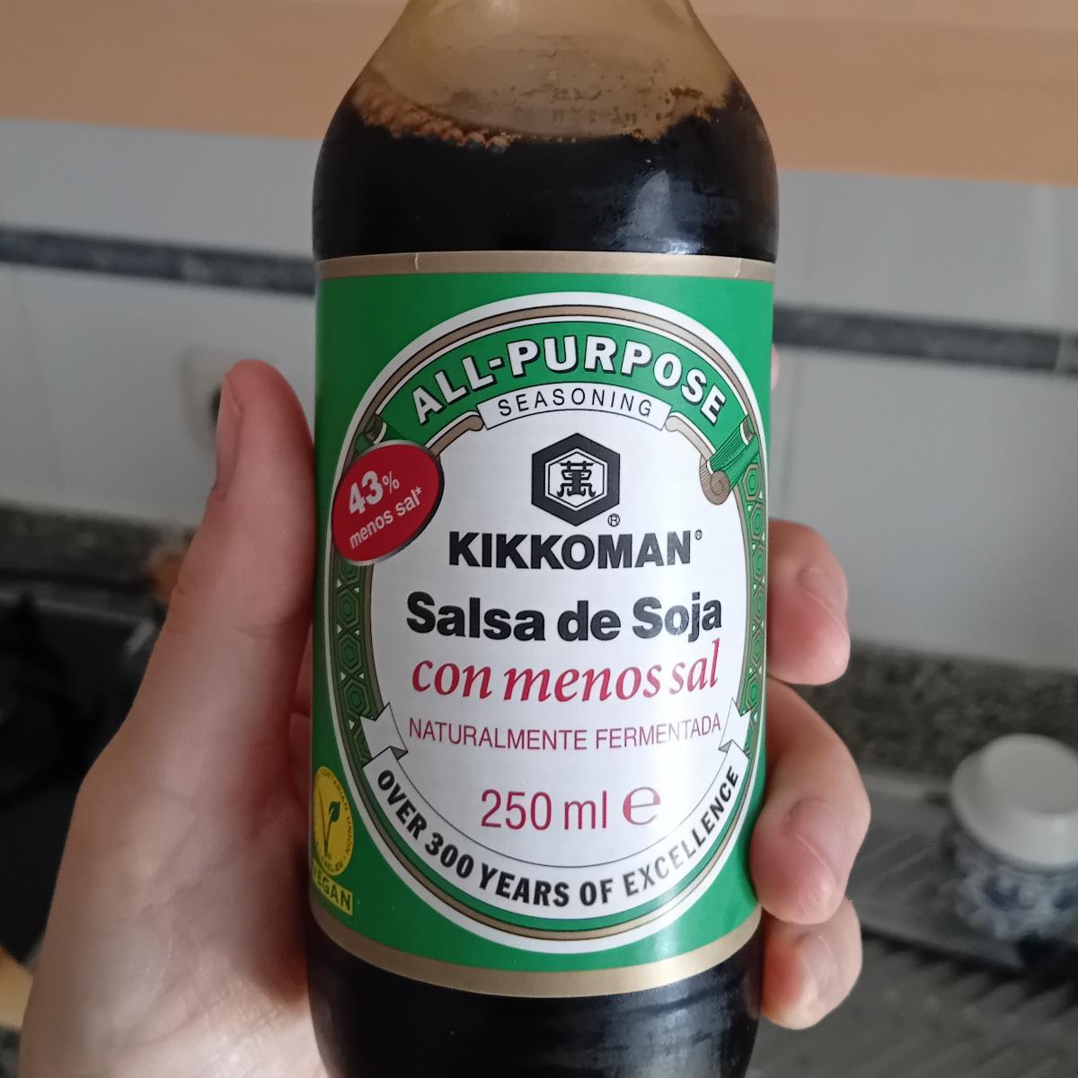 Bote de salsa de soja de la marca Kikkoman. Esta es baja en sal y más saludable que la normal. Perfecta para aderezar y cocinar.
