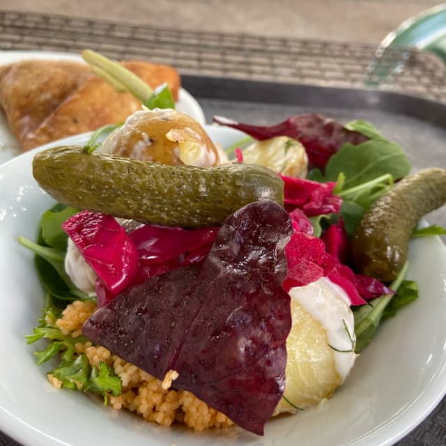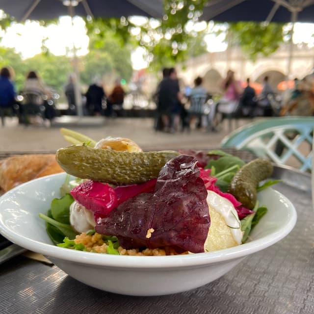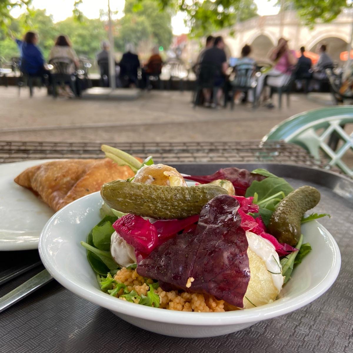I imagine the options change, but do note that not all are vegan-friendly: I just mentioned i wanted a mix of the vg options and this was what i got. It was nice small bowl to go with whatever you’re having. The potatoes had a coconut yoghurt dressing, there’s couscous and some pickles too. Considering how much you get, it’s not the cheapest (Richmond prices?). Still, it’s a tasty bowl of greens.