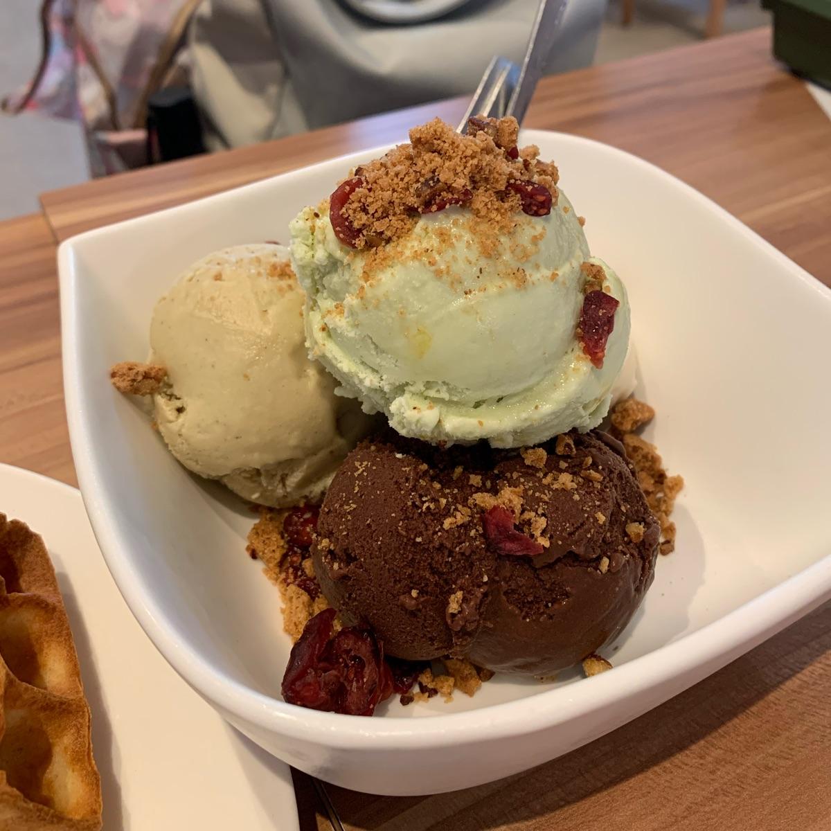 We ordered the 4-scoop ice cream “Mad Bowl” that comes with 2 toppings, and paired it with a waffle. Flavours we got - Soursop Lime, Pistachio, Oat Dark Chocolate and Kaya Pandan. Two toppings - cranberry bits and biscoff crumble. Among the flavours we chose, good ol’ chocolate paired the best with the fluffy (crisp on the outside) waffles! The others were premium flavours that would have stood well when eaten on their own. 😋 The soursop lime is a personal favourite too - the refreshing flavour balances out so well the other flavours and savoury mains we had before. The cranberry topping was a surprising win too, for that added texture in the ice cream. Do check out the interesting vegan ice cream flavours available. :)