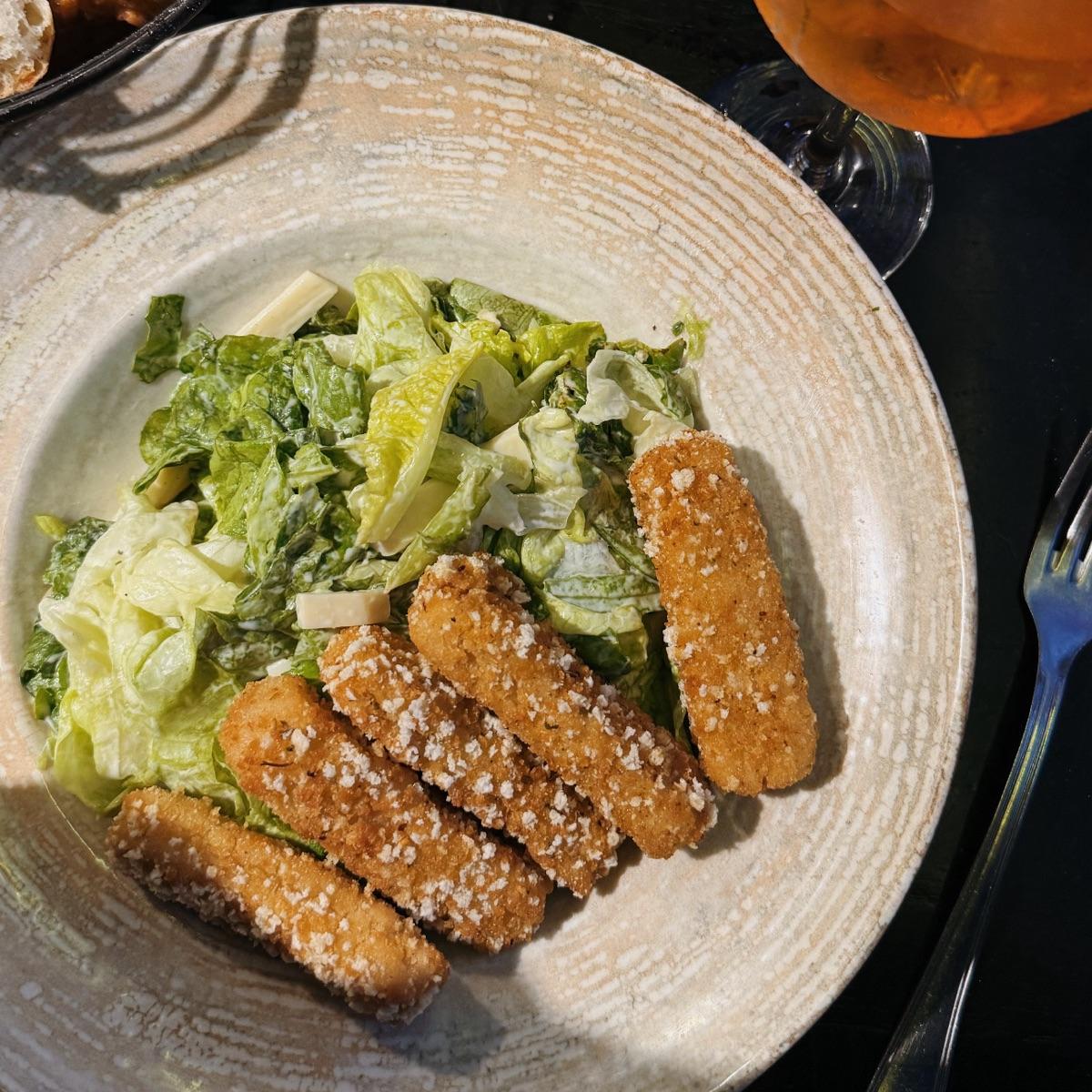no vino con croutones. el dressing estaba meh. los bastones de NotCo: bastante bien. no la volveria a pedir