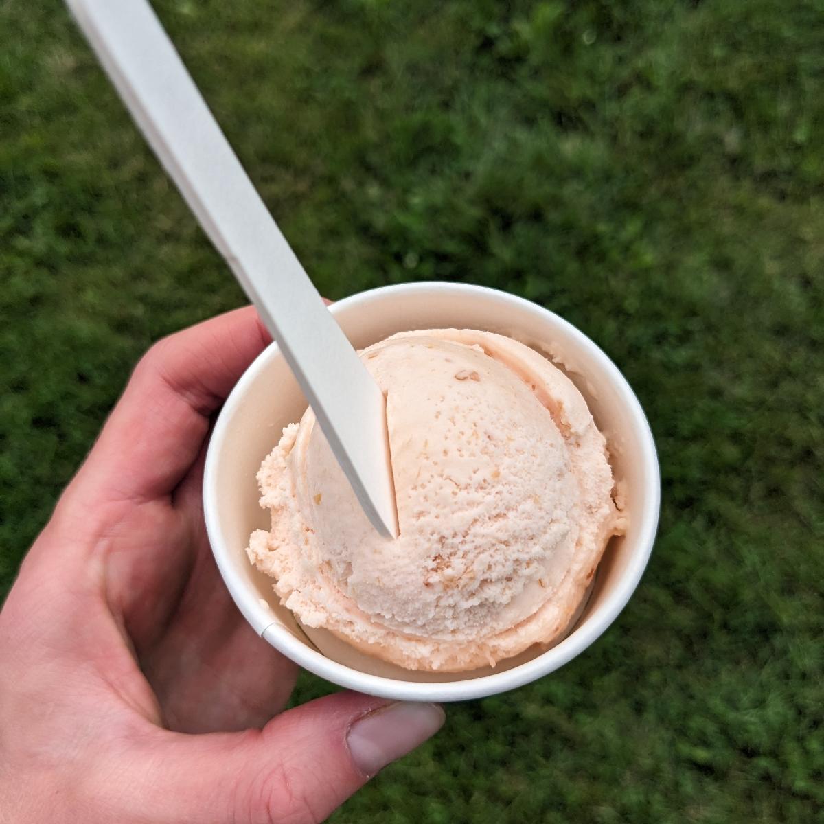We kicked off #burlingtonvegfest with gelato because I was so excited to try this place and it was a hot day! This was refreshing and peachy, but I was hoping for cobbler and peach chunks or something. It was more of a peach #sorbet than I was looking for. One scoop was $6. #gelato #vegangelato #peach