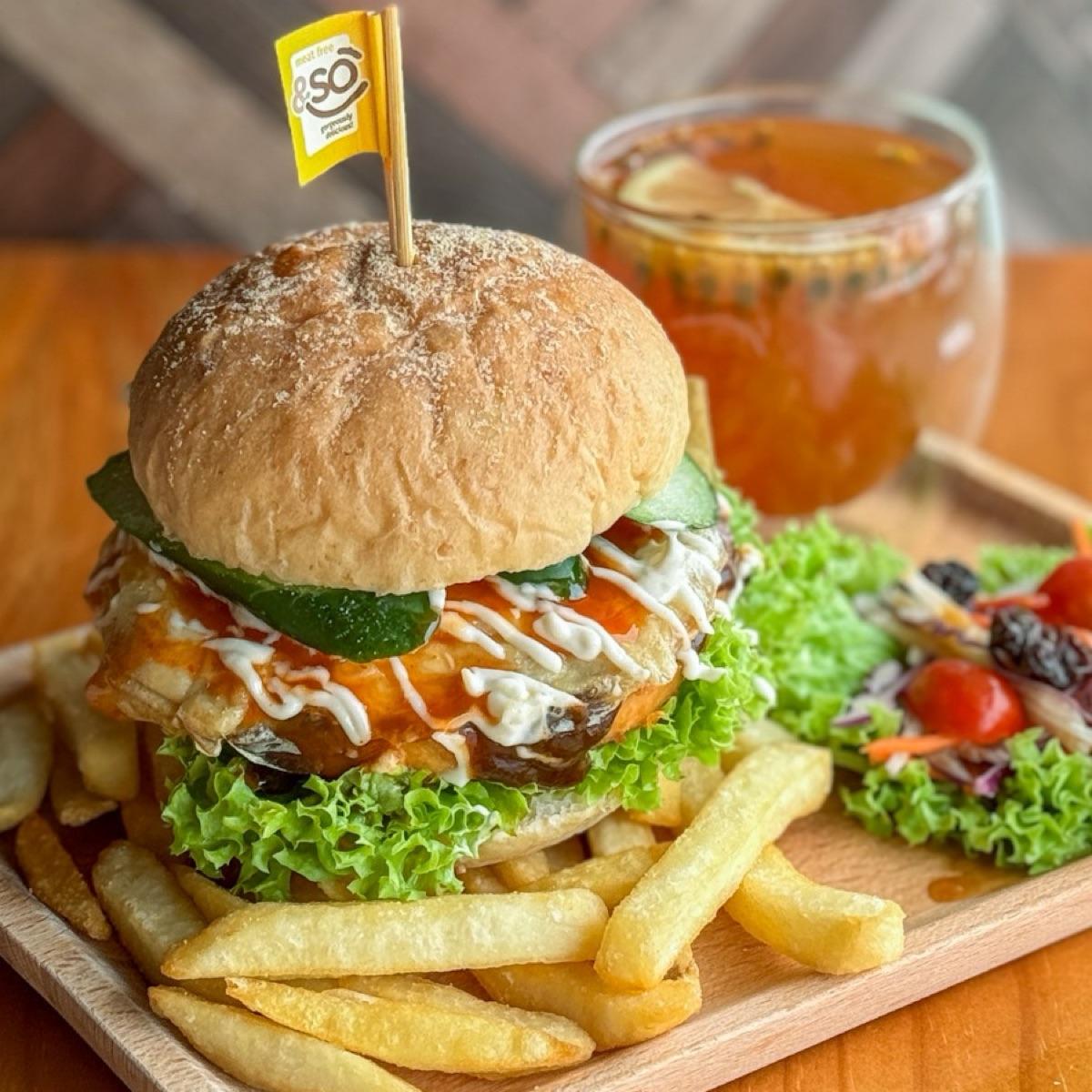 PlantEgg adds a delightful richness. The chef's special black pepper sauce combined with the dijon mayo and chili sauce creates a perfect harmony of spicy and tangy. The Japanese cucumber and coral lettuce add a fresh crunch that rounds out the burger beautifully. This is definitely a must-try for anyone who loves a delicious, satisfying burger!