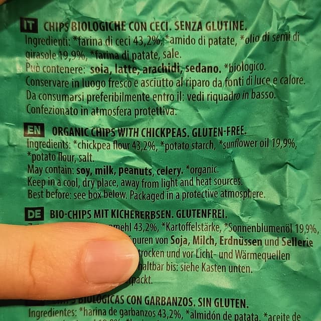 Ottime chips che non sono chips! Sono di ceci e non di patate, quindi con apporto nutrizionale diverso, e sicuramente meno unte. Anche come sale direi che siamo sotto rispetto alle classiche chips e questo per me è un super punto in più. Il sapore è davvero gradevole, sono un ottimo snack spezzafame/salvavita quando si è in giro e si ha bisogno di uno spuntino, ma anche a casa per l'aperitivo fanno ottima figura!