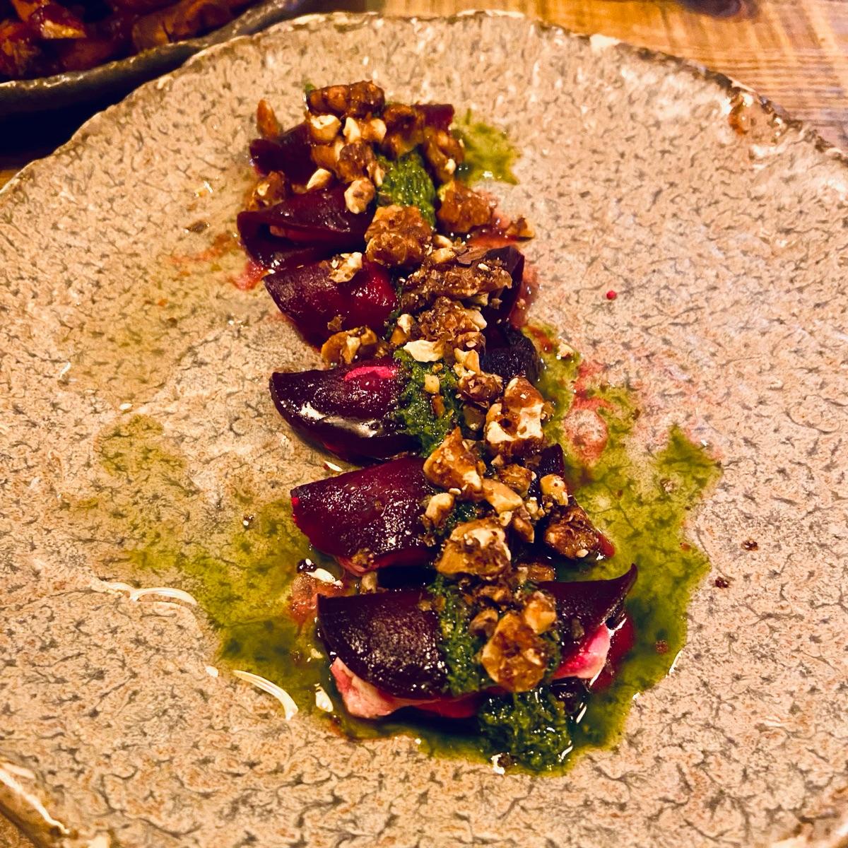 La concezione di ravioli è molto diversa dalla mia, si tratta di fette di barbabietola piegata e ripiene con ricotta veg coperto il tutto da frutta secca e pesto.