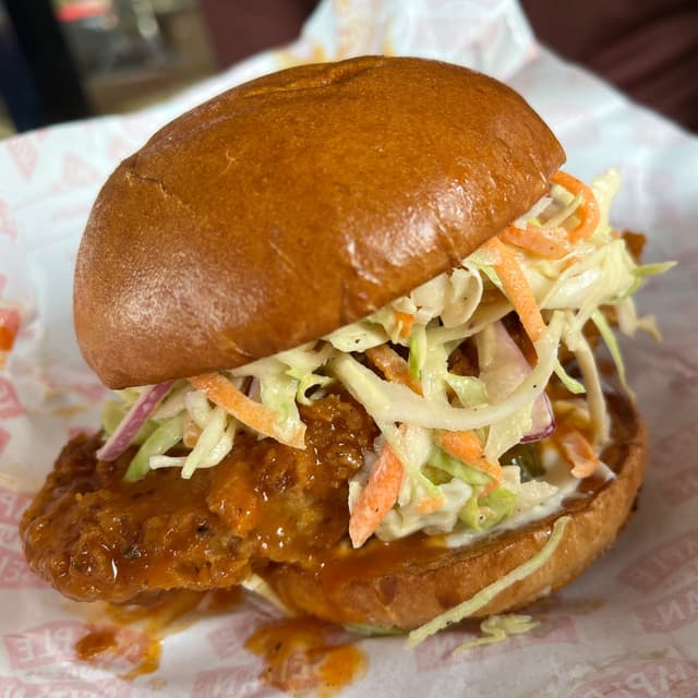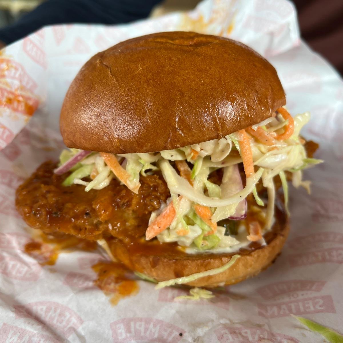 🌶️🍔 This is #seitan redesigned as #friedchicken with a warming #buffalo glaze and cooling #coleslaw on top. Our French guest went back for this burger as he wanted more and something #spicy this time. It was nice with a kick. 🦵it’s also #sweetdreamsaremadeofgrease The tablet menu you order from has lots more options than appear on the sign. I want to try everything on the menu here so it’s always tough. I wish we had one closer. Great #veganrestaurant chain to support if you like #fastfood and #veganjunkfood. I’m drooling over this now 🤤and want one. #saveveganrestaurants #veganlondon #londoneats