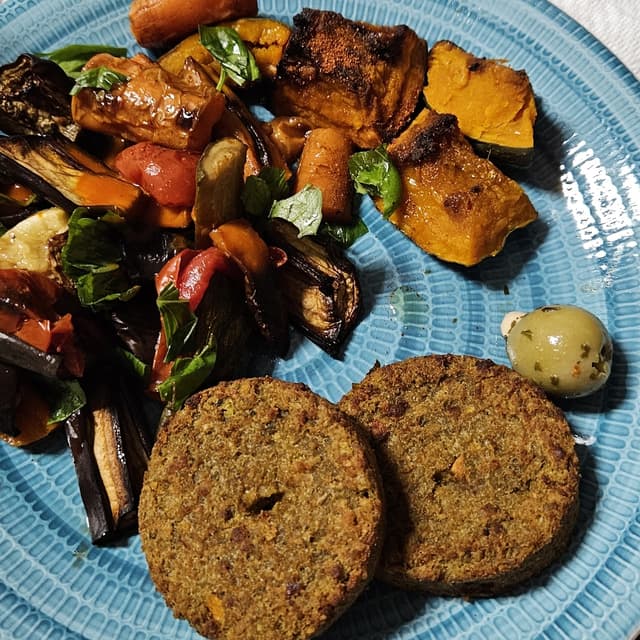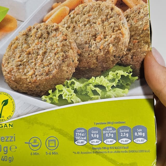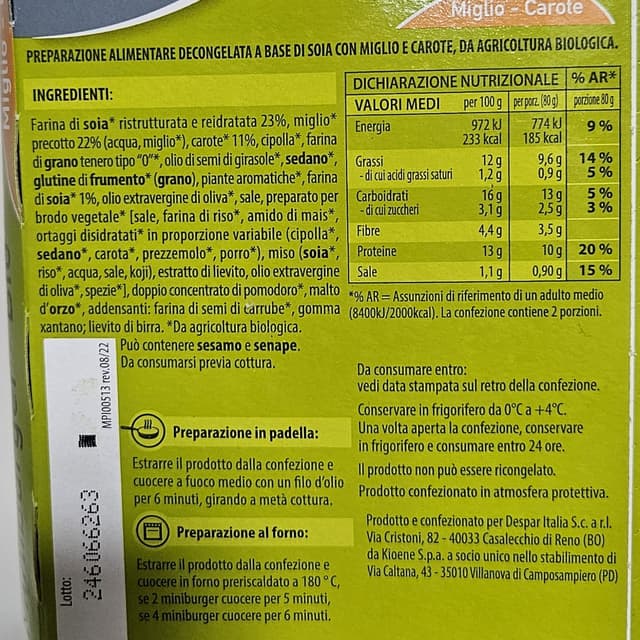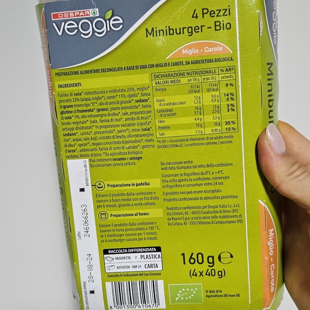 Piccoli burger a base di farina di soia, glutine di frumento, miglio e carote. Onestamente mi sono piaciuti tantissimo! Hanno un sapore delicato con un leggero retrogusto dolcino dovuto alle carote. Gli ingredienti e i valori nutrizionali sono decisamente meglio della versione con i pomodori secchi.