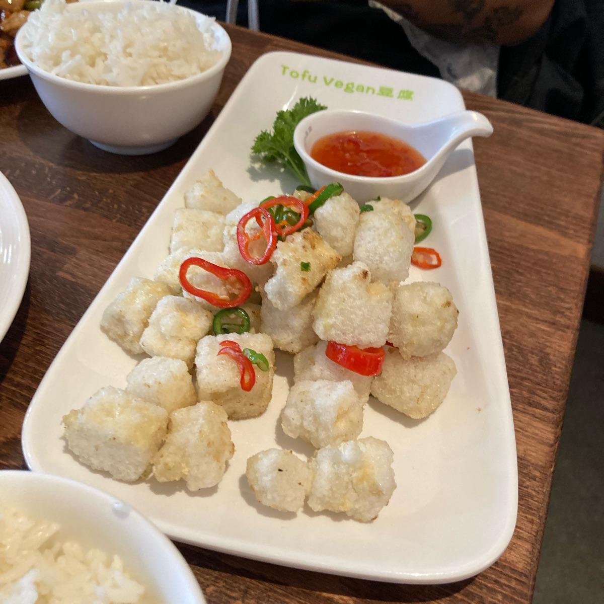 Of course #sweetdreamsaremadeofgrease and anything #deepfried would conquer my heart, especially #tofu, which after 8 years as a #vegan I like to devour even raw with a little soy sauce 😜 anyway this was amazing, lobe the mix of spices on top and the sweet and sour sauce to dip it in. #veganlondoneats