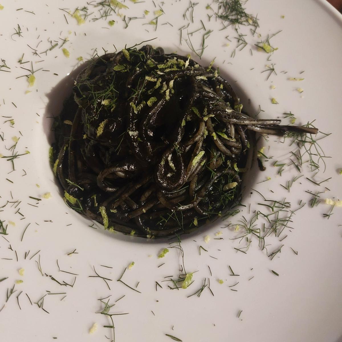 Per i nostalgici un vero ricordo degli spaghetti al nero di seppia, per i ricercatori un piatto sublime! Alghe, carbone vegetale, limone e ingrediente top concentrato di pomodoro essiccato al sole!
