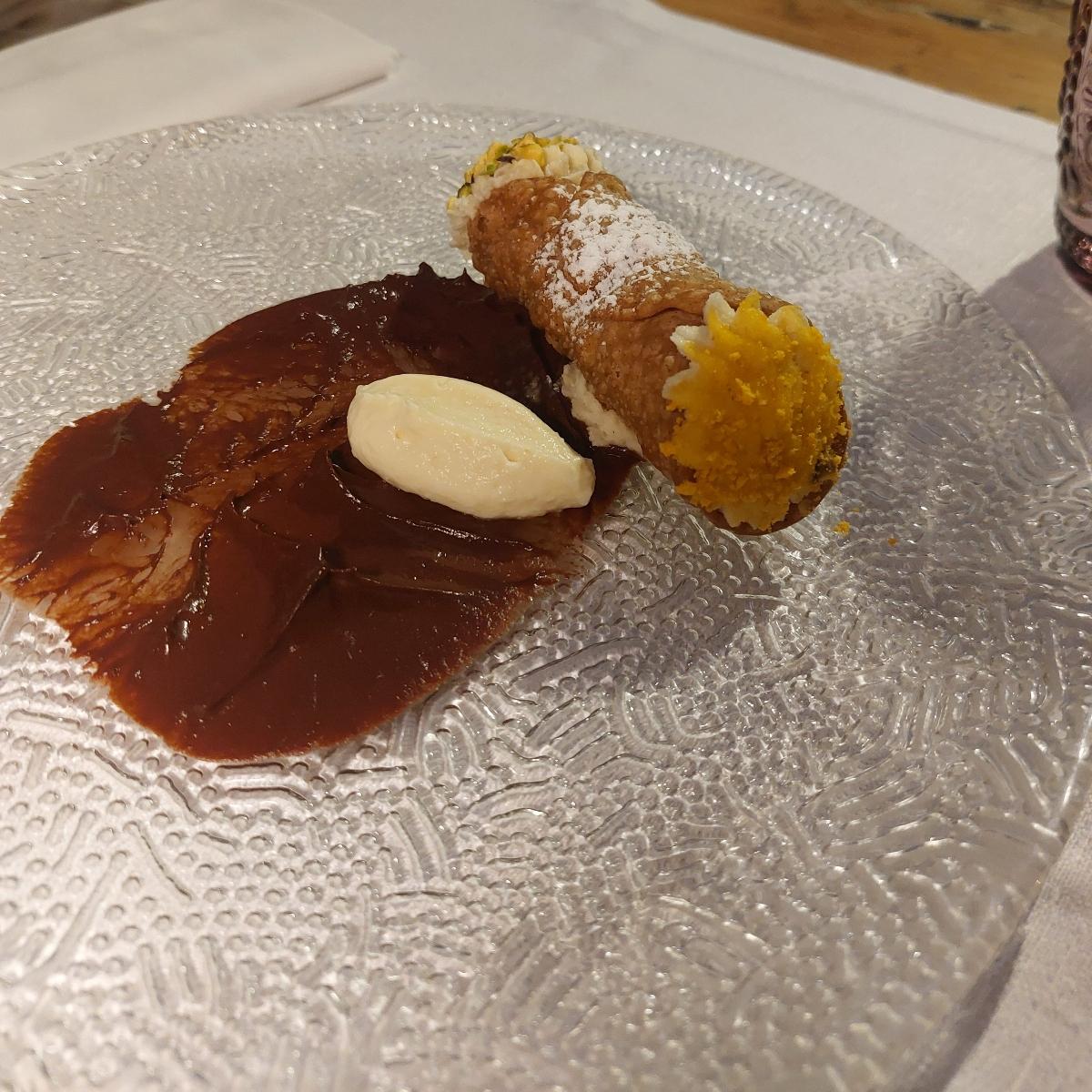 Cannolo con ricotta vegana e crema al mango. Fragrante e dolce al punto giusto!! Non poteva mancare nel loro menù!Prezzo: 5€