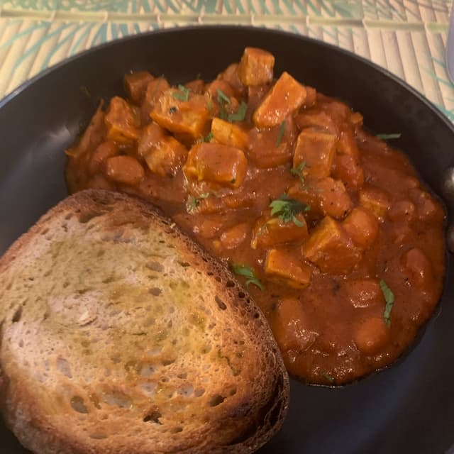 Tempeh bio con fagioli, sugo, tofu affumicato e crostino di pane all’aglio. Piatto molto saporito e particolare. Non lo terrei nelle proposte estive. Personalmente mi è piaciuto anche se l’affumicatura l’ho trovata un po’ troppa e pesante.