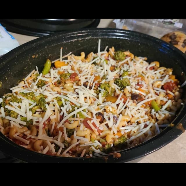 Sur la photo, c’est du macaroni à la « viande » préparé avec brocolis, tomates, sauce tomate, fausse viande gardein et fromage daiya
