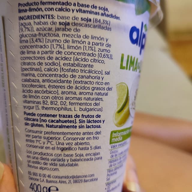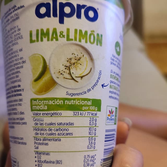 Yogurt con base de soja y sabor lima limón de la marca Alpro.