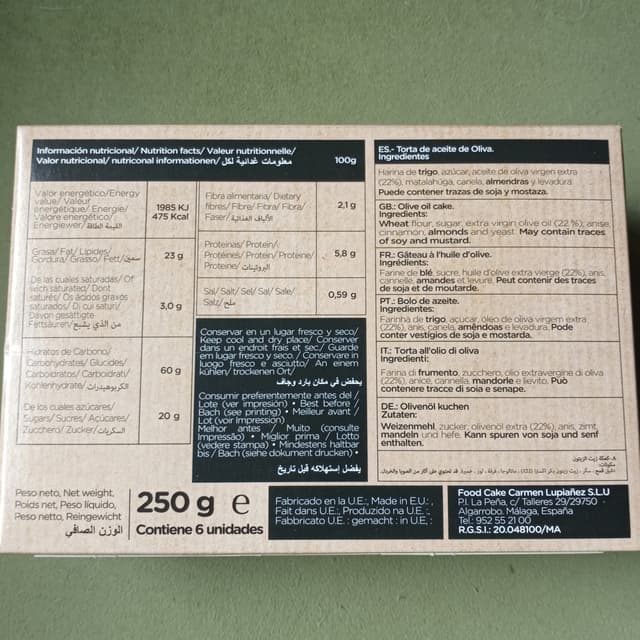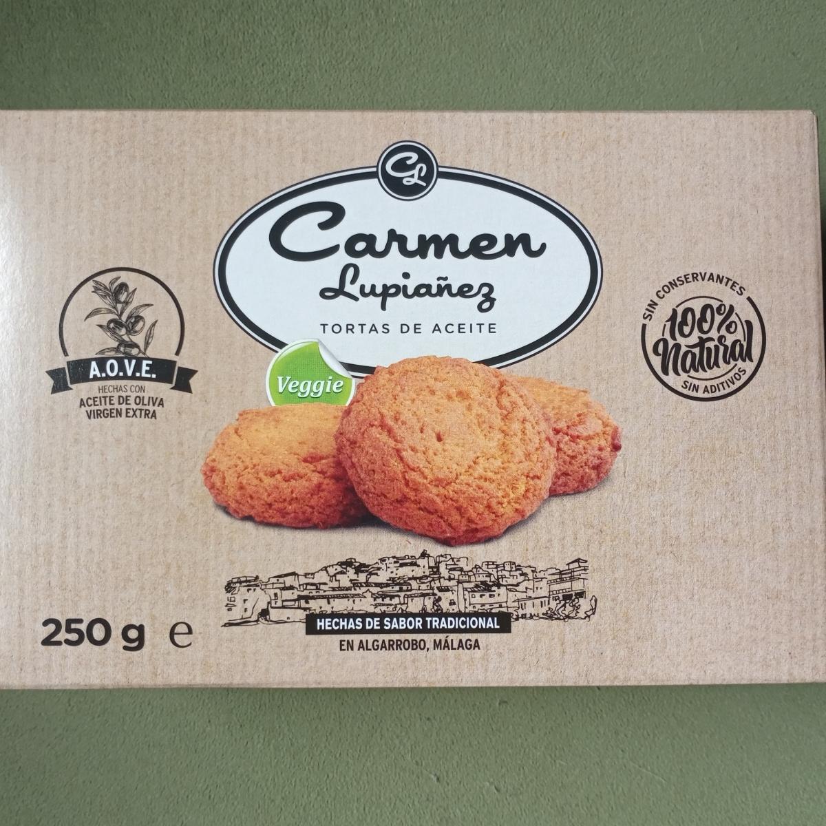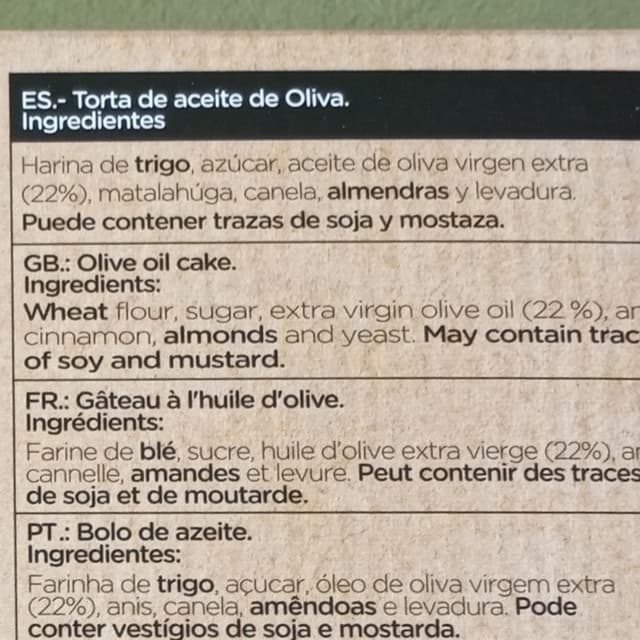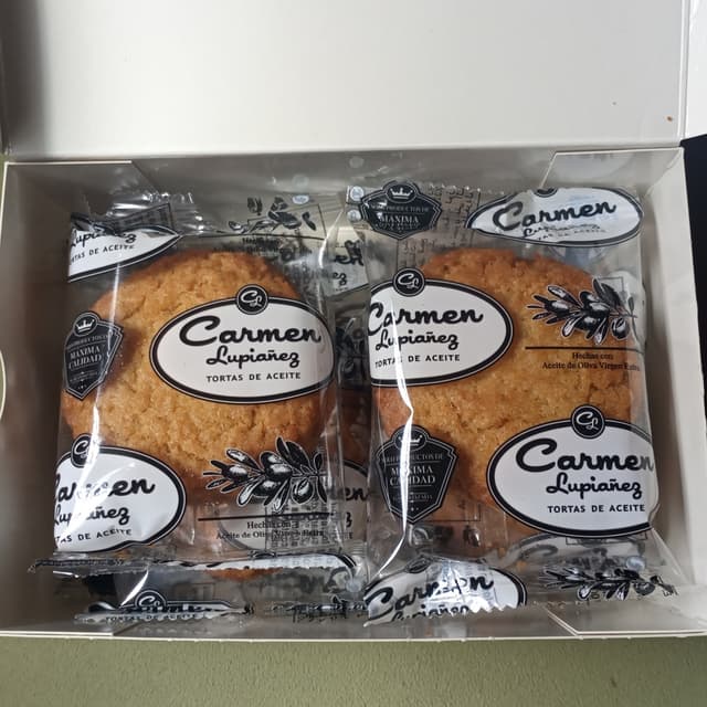 Galletas dulces con harina de trigo, azúcar y aceite de oliva, "tortas de aceite de oliva". Vienen en caja de cartón, solo 6 galletas, envueltas individualmente para multiplicar los residuos. De sabor están bien, pero para mí nada extraordinario, sin embargo mi pareja está enganchada a estas galletas.