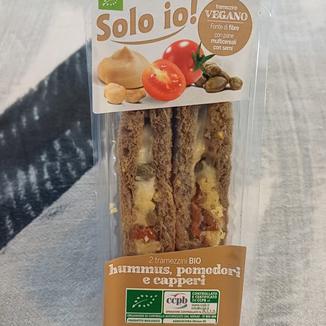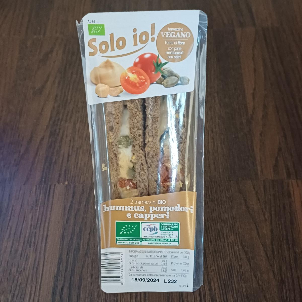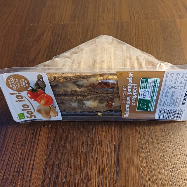 Il pane é multicereali, base cremosa data dall'hummus, con pomodori e capperi. Abbastanza saporito e ben farcito.