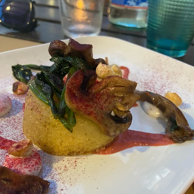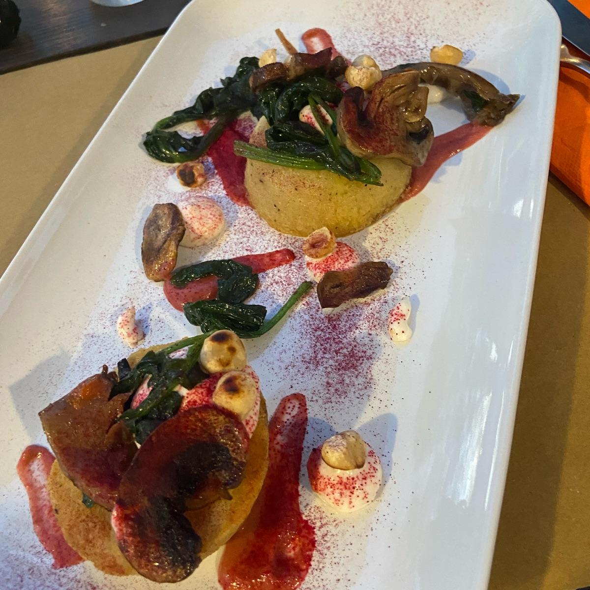 E passiamo ora al menu cena, questo agriturismo fa anche ristorazione e abbiamo cenato lì tutte e due le sere del soggiorno 🔝. Piatti bellissimi ben presentati vari e fantasiosi, quasi ricercati, avevamo l’imbarazzo della scelta. Questo era un tortino di patate con veg cagliata affumicata, funghi spinaci nocciole e maionese alla senape - ottimi abbinamenti, bello e buono #tortino #patate #antipasto