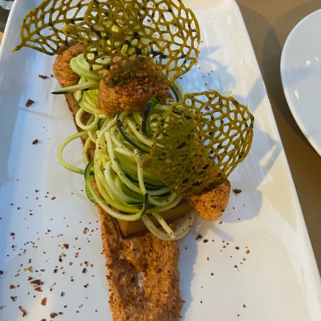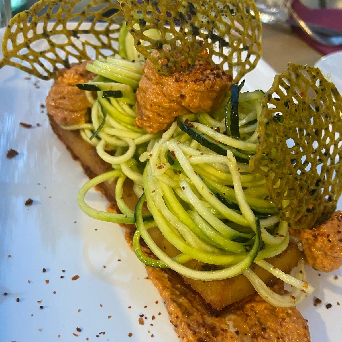 Bellissimo piatto anche solo per la presentazione. Di base era una farinata un po’ spessa , condita con pesto di pomodori secchi, melanzane spaghetti raw di zucchine e cialde croccanti alle olive #cecina #gourmet #antipasto