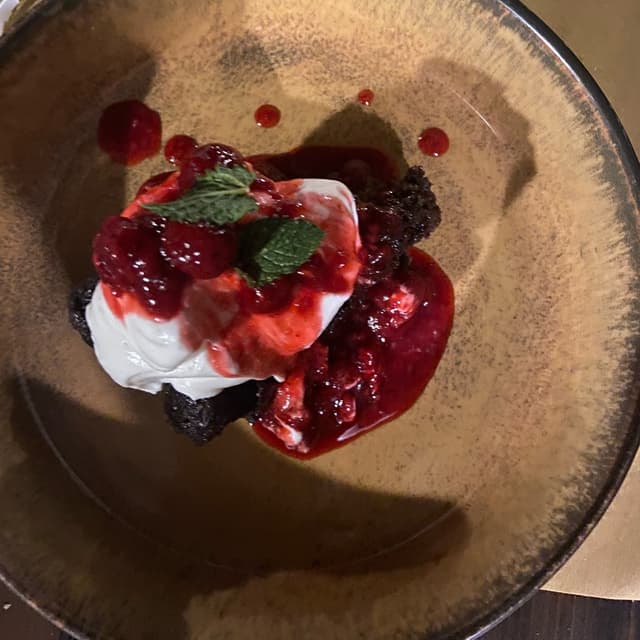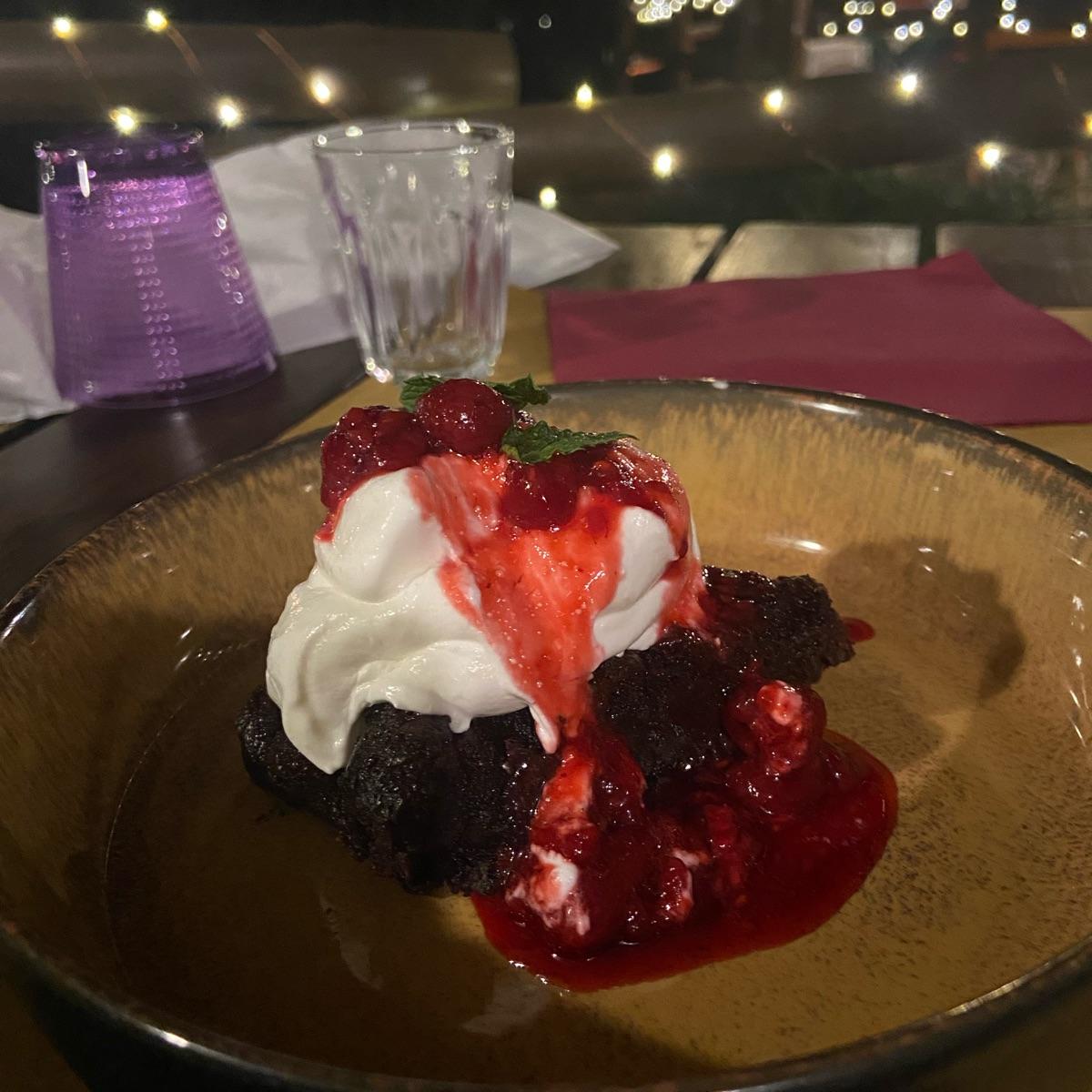 Torta caprese accompagnata con panna e lamponi, buona ma non wow (o più che altro era più panna che torta 😅) #torta #caprese #dolce #cake