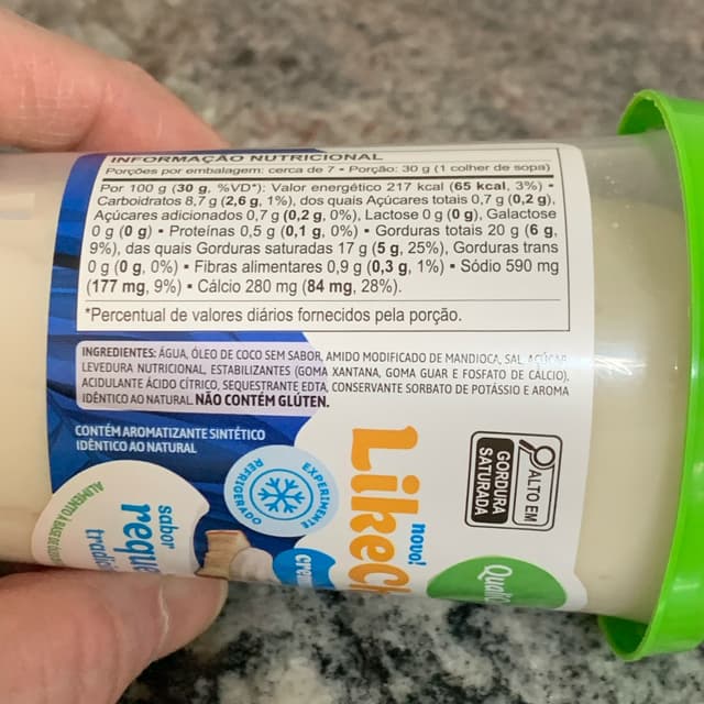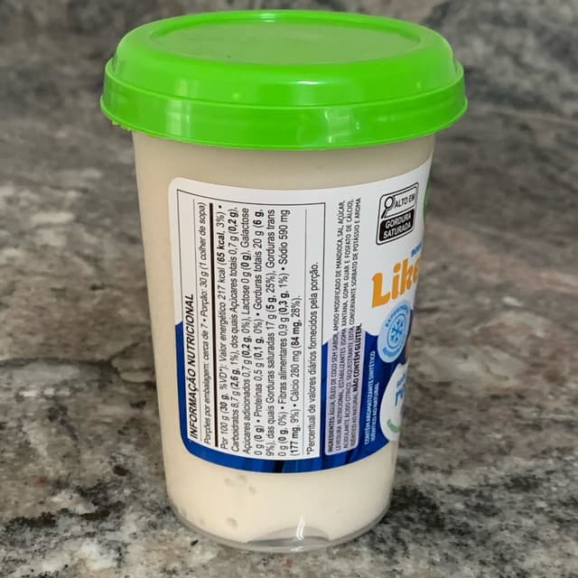 Água💧, óleo de coco 🥥 sem sabor, amido modificado de mandioca, sal🧂, açúcar, levedura nutricional, estabilizantes (goma xantana, goma guar e fosfato de cálcio), acidulante ácido cítrico, sequestrante EDTA, conservante sorbato de potássio e aroma idêntico ao natural.