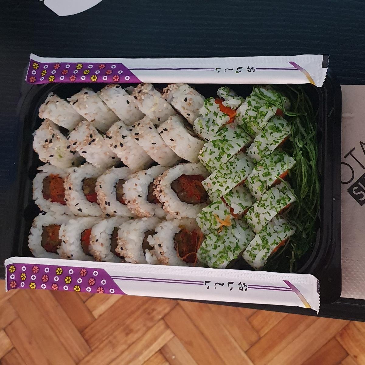 Es muy rico y tiene un precio razonable. La presentación no es muy detallista, llego con algunas piezas rotas. Fuera de eso la combinación de hongos, palta y cebollita es un 10!! Los otros rolls: de berenjena, tomate disecado y verduritas o el de tofu, palta y zanahoria, no se quedan atras. Recomiendo fuerte 💖🌱