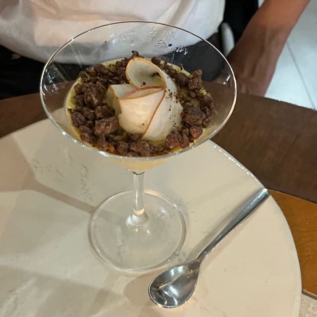 It was a saffron cream with pear and a chocolate granola. Something simple yet very original. The taste was not overly sweet and the saffron gave it a sophisticated touch.