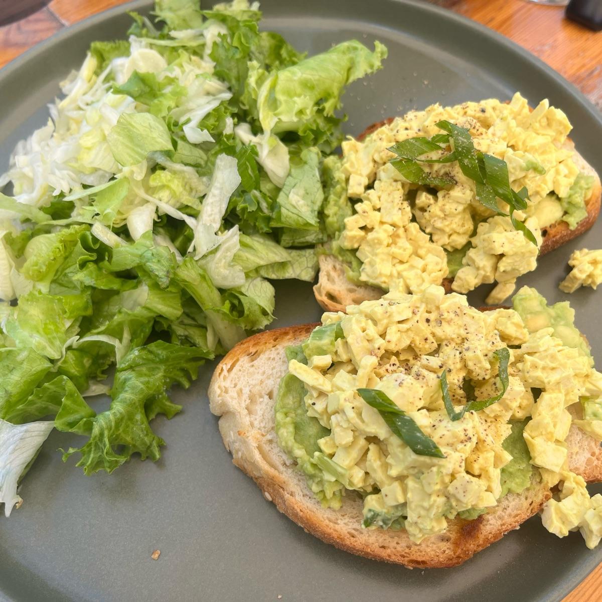 Avocado Toast; toasted bread, veg egg (suspect tofu) avocado, served with a green salad.