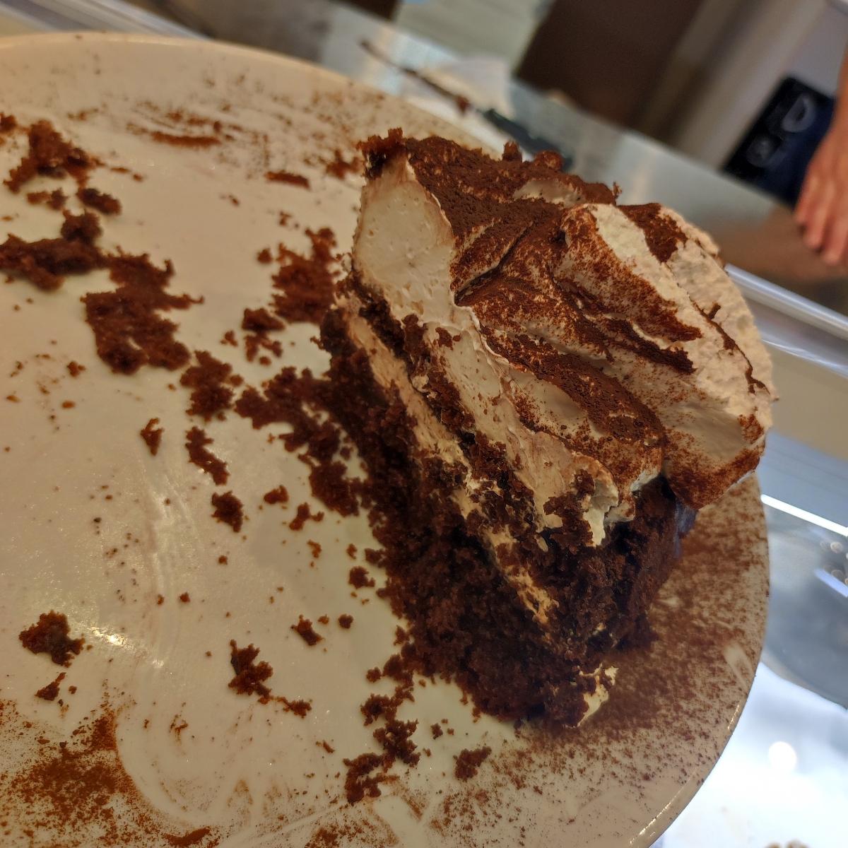 Dolce muretto con Pan di spagna al cioccolato bagnato al caffè, crema al cacao e nocciole e panna. Molto buono! Unima merita davvero🤟🏻🌱