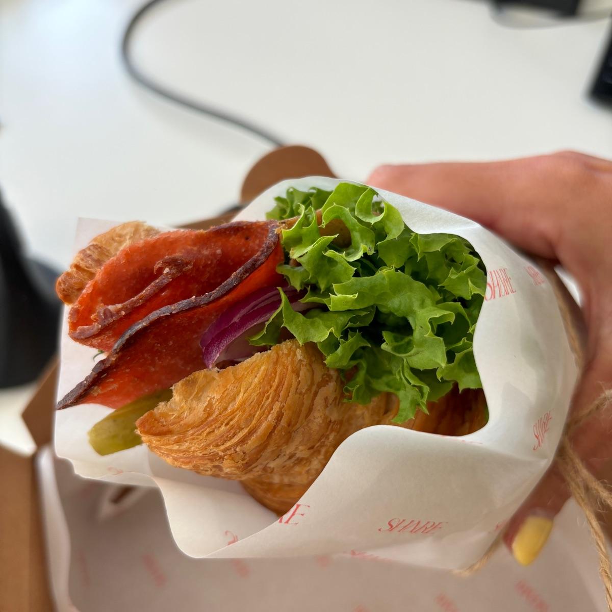 Bought this savory croissant for lunch. Made with cold cuts from Bezmasna (the very first plant based butcher shop in the country)!!! Got a cheeky lemon loaf slice too 🍋💛