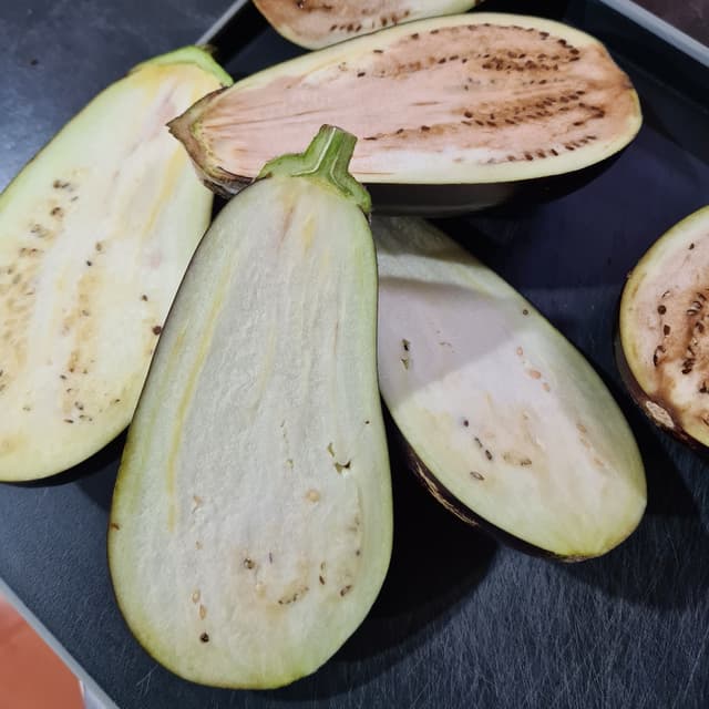 I have roasted the #brinjals, face down untill the flesh was soft and easy to remove as a whole with a spoon I used the wet/dry/wet/dry methode to coated them, fried in a bit of oil until crispy and to serve as a fillet, it was delicious. Note: Add nori flakes to your dry mix, and you have vish fillets.
