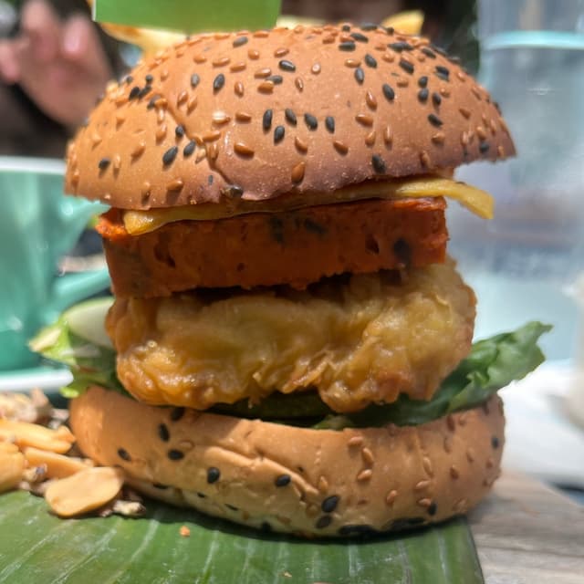 No nasi in this burger… misleading name- that’s probably the only complaint. Still, a pretty bomb burg. Thick slap of vegan #otah , “ayam penyet” #dynameat , cucumber and sambal