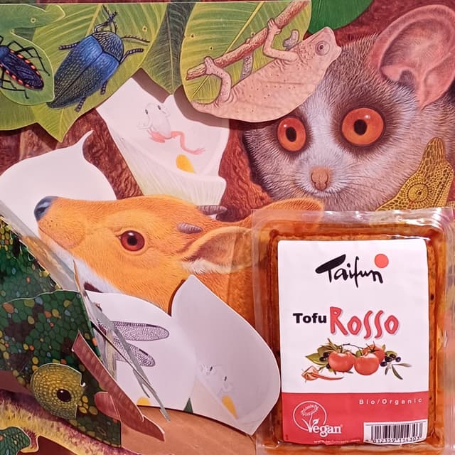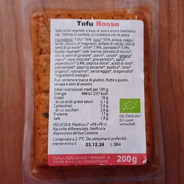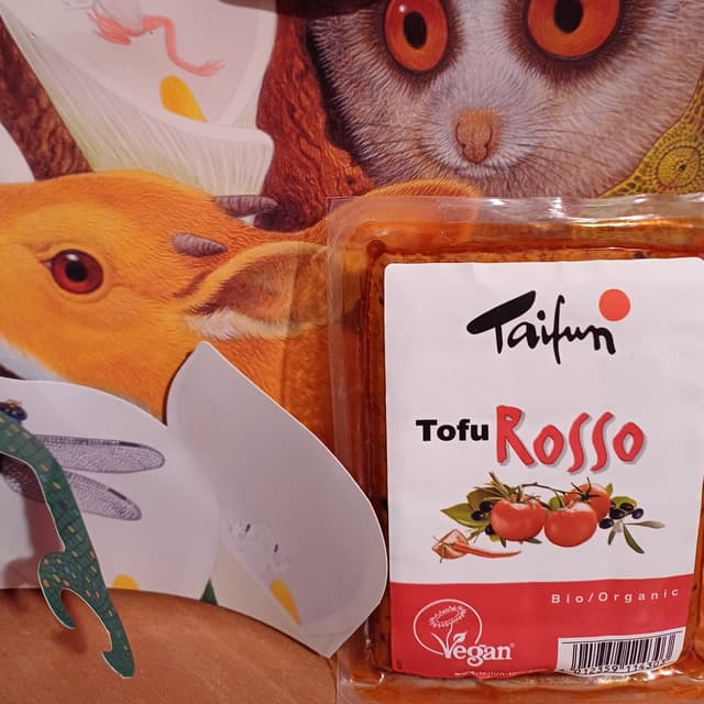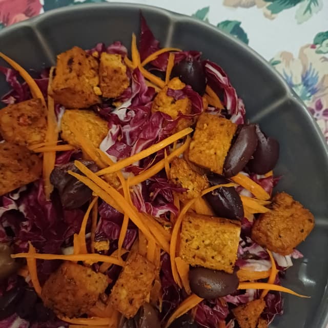 Questo è un tofu diciamo "alla pizzaiola" cioè con pomodoro e olive, spezie e tante erbe aromatiche. Yuka lo penalizza dal punto to si vista nutrizionale per il troppo sale e la presenza del solfato di calcio. Io non ne ho apprezzato la consistenza parecchio friabile. Tagliato a cubetti (le parti più esterne del panetto si sono sfaldate subito), rosolato in forno e mangiato insieme ad un'insalata di radicchio rosso con carote e olive.