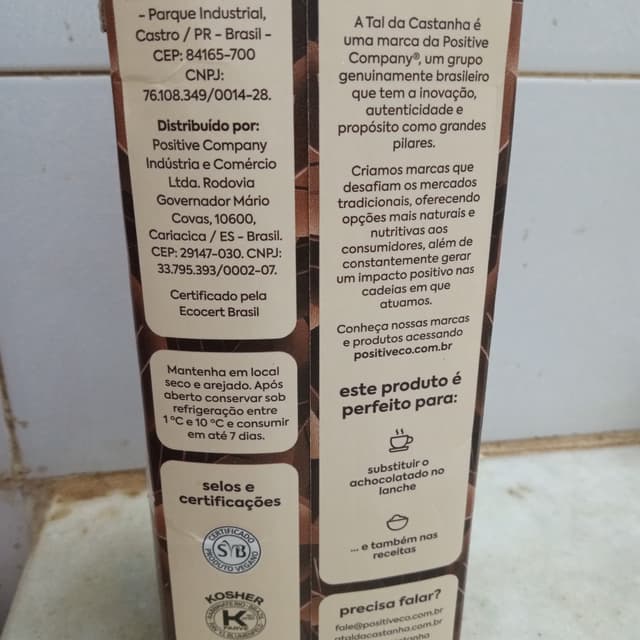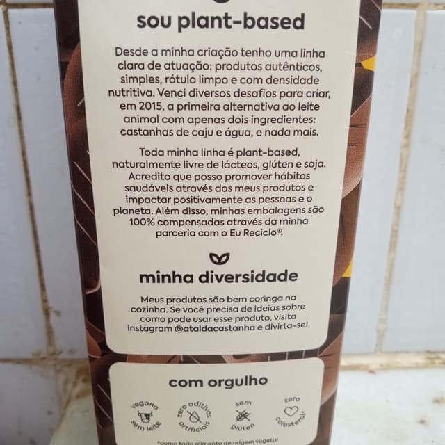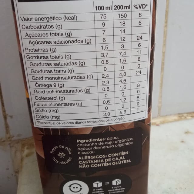 Bebida à base de castanha de caju, com cacau e açúcar demerara orgânicos, sem soja, muito saborosa e nutritiva.