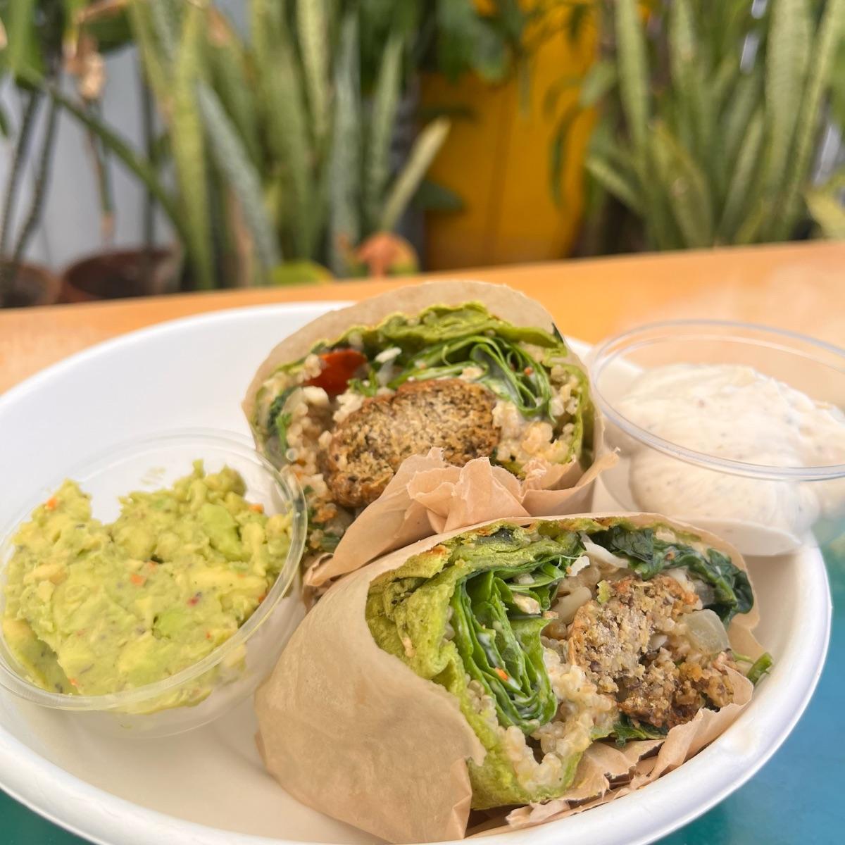 The menu lists the ingredients as Black Bean Chickpea Balls, Quinoa, Kualoa Spinach, Ali'i Mushrooms, Cherry Tomatoes, Fresh Diced Yellow Onion, Famous Garlic Aioli Drizzle, Vegan Cheese served with side of Avo Mash and Garlic Aioli. I actually thought that they got me a wrong burrito because it seemed that what I got was falafel and quinoa. I didn’t notice any black beans or any much else. I still liked it a lot, though, and after reading the ingredients again, I realize that the black beans and chickpeas balls are actually the falafel. The grilled spinach wrap is really great to take on the go to enjoy at the beach because it holds up well and not get soggy.