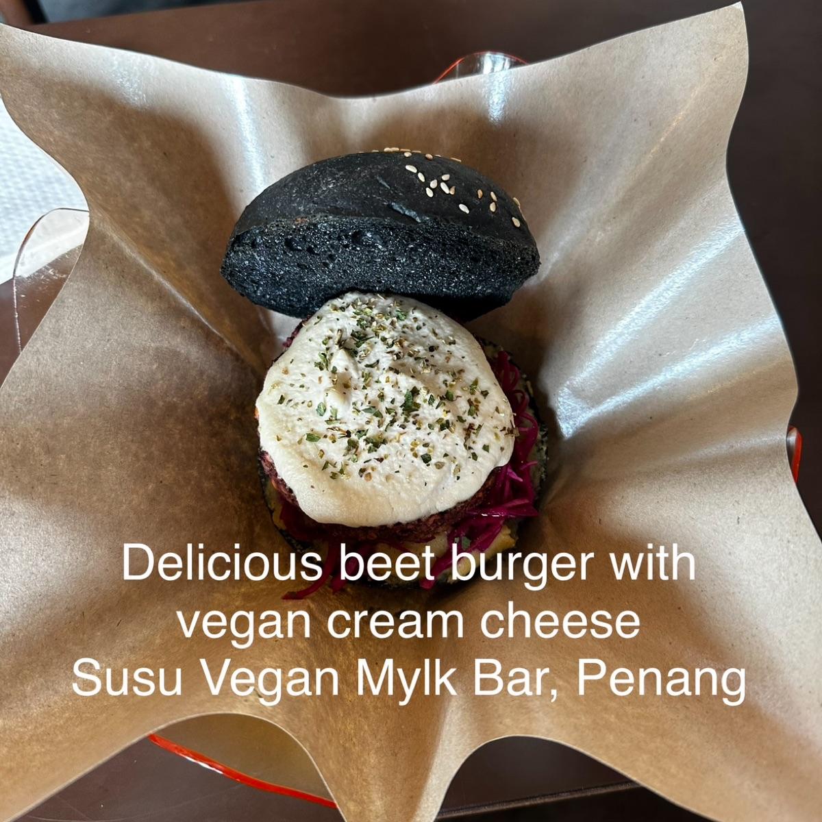 An interesting black burger with tasty vegan cream cheese. Lovely quirky cafe.#vegangill #runfortheirlife