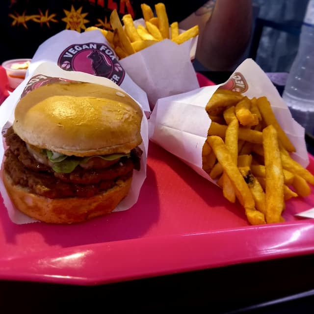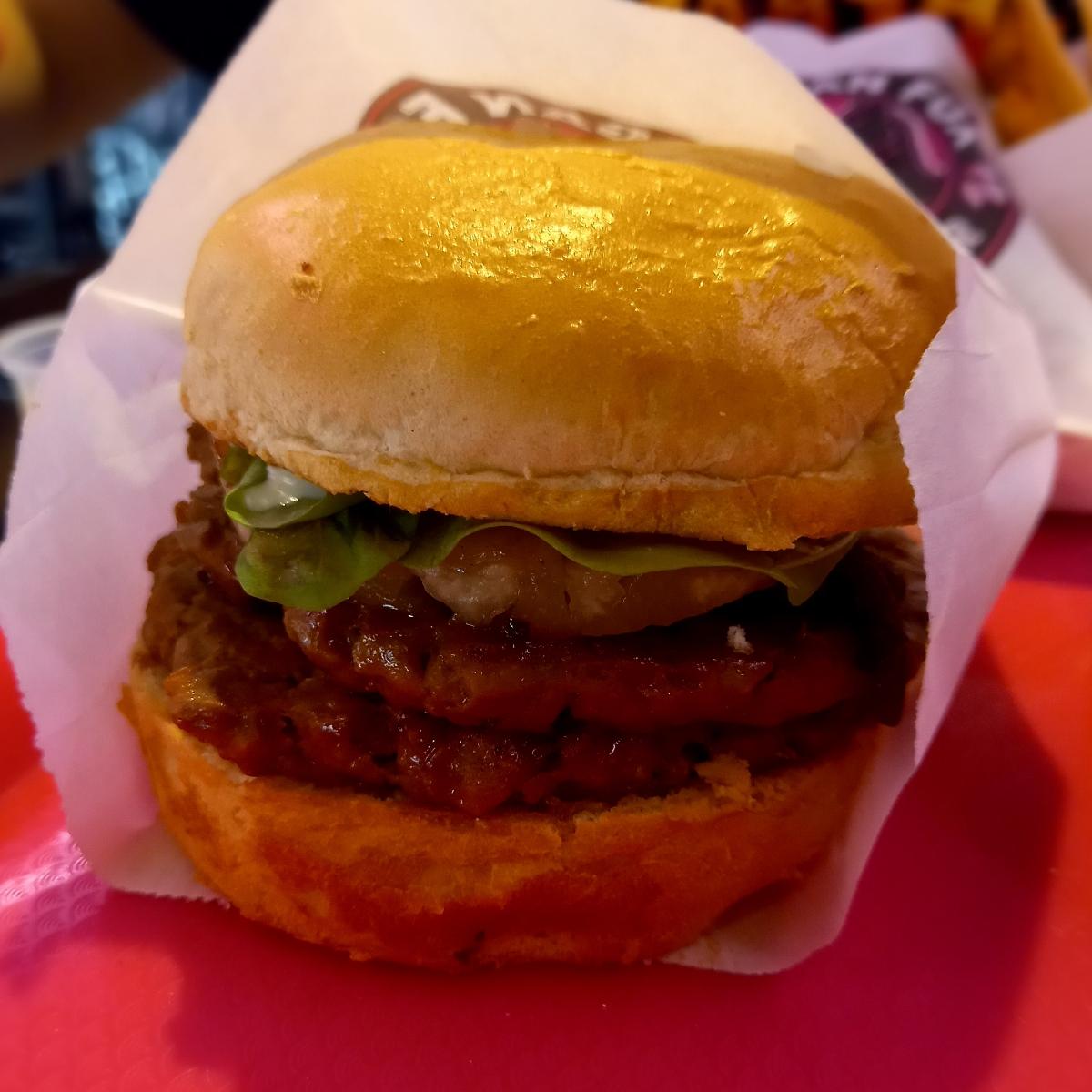 Doble Smash Not Burger, pinceladas con tabasco chipotle, ananá, cebolla caramelizada, rúcula, alioli y cheddar (yo pedí sin),($11000, Oct 2024). + Sobre grande de papas fritas $3500 (ya no vienen en combo). Personalmente siempre me encantó la combinación de sabores de esta hamburguesa, pero creo que las rodajas de ananá vienen muy grandes y complican el comerla sin que se desarme, y otra cosa, ya no le siento tanto el tabasco (?).