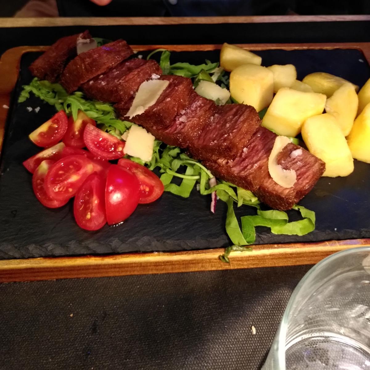 Tagliata vegetale stampata in 3D per ricreare la consistenza della carne. Costa 22€, che non è poco, ma è veramente buonissima. Il sapore non è troppo intenso, e viene esaltato dall'olio al rosmarino con cui viene servita. Buone anche le patate! La cosa che più stupisce è la consistenza "cicciosa", che non avevo mai ritrovato in questo modo!