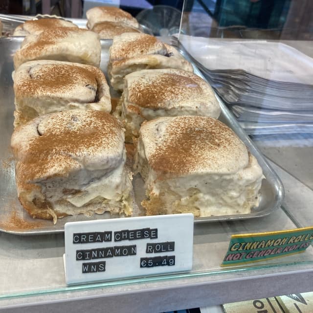 In #Dublin in September the weather was already chilly and we embraced the colder weather and ordered us a #cinnamonroll covered in #cream and extra #cinnamon. Good one (although the one we then had in Glasgow was even more delicious) and such a cute sign next to it!! ✨Cinnamon rolls not gender roles✨