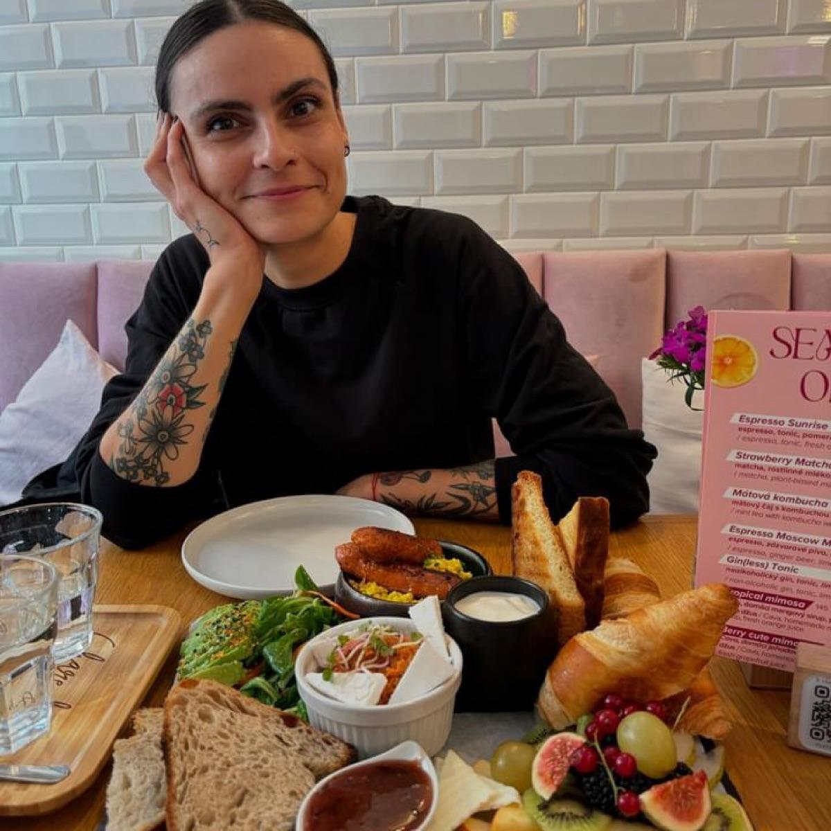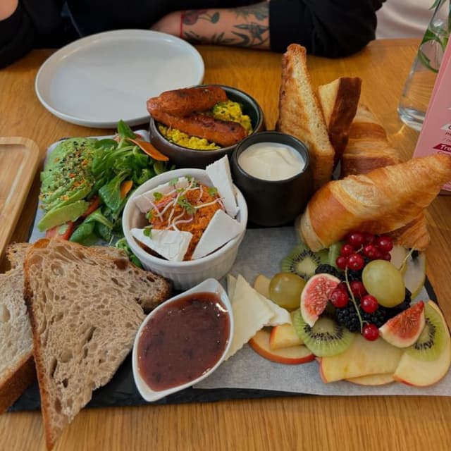 This was a proper vegan feast! Scrambled tofu, sausage, croissants, chickpea spread, salad, fresh fruits, toast, butter and jam, yogurt,... Delicious and comforting!