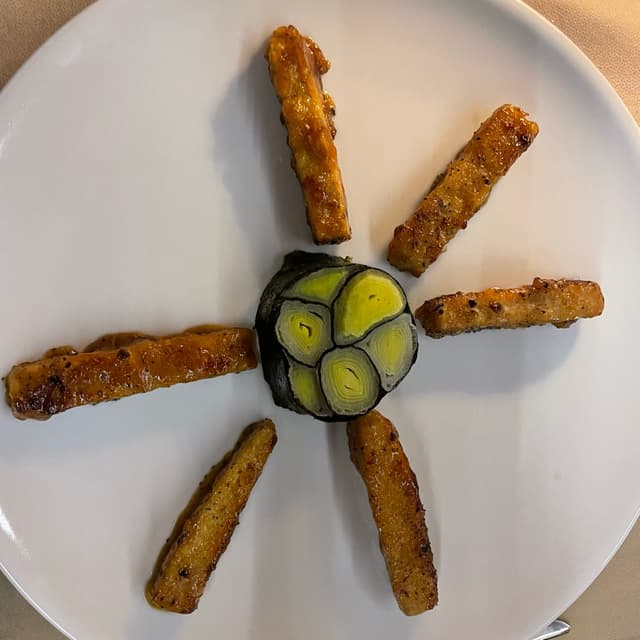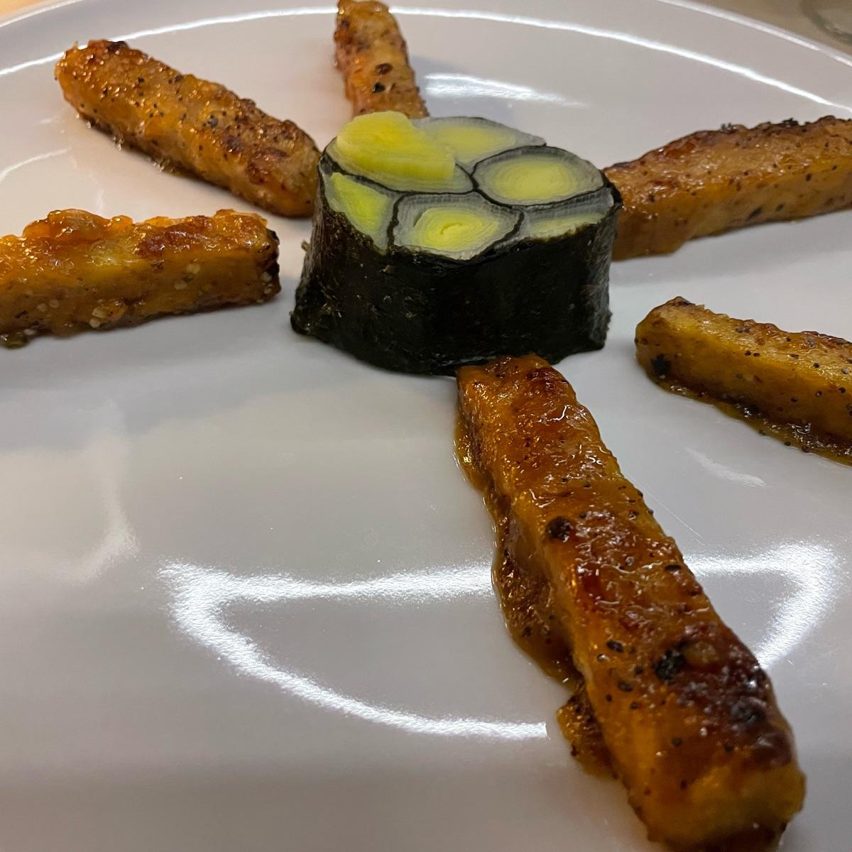 tempeh caramellato, pepe, arancia, semi di canapa, porro, alga Nori.. Tempeh preparato molto ma molto bene!