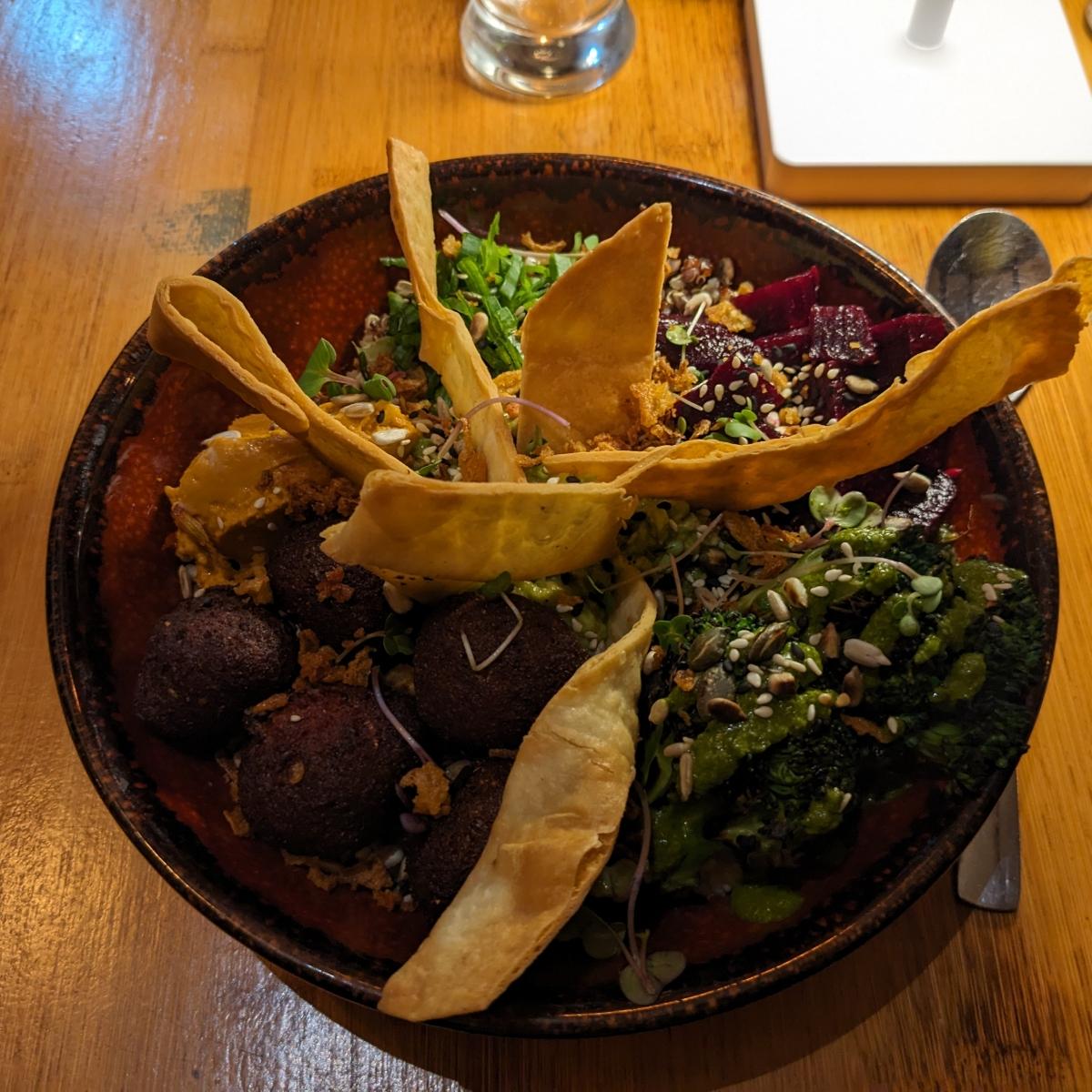 This was just as amazing as the poke bowl. The pink falafels were so fun and delicious, there were so many fresh veggies, and the soft bread chip strip things were divine. It was a big filling portion. #buddhabowl #falafel #veganisnotscary