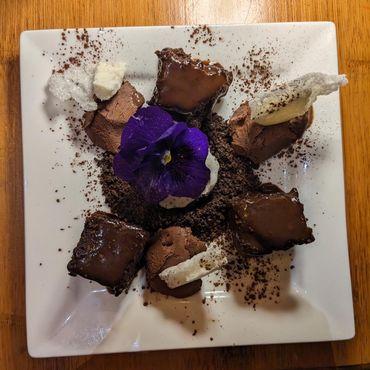This was the first vegan dessert we found in South Africa! It was incredible, with fudgy dark chocolate brownies, chocolate sauce, pieces of merengue, and cookie crumbles. #veganchocolate #brownie #vegandessert #merengue #veganisnotscary