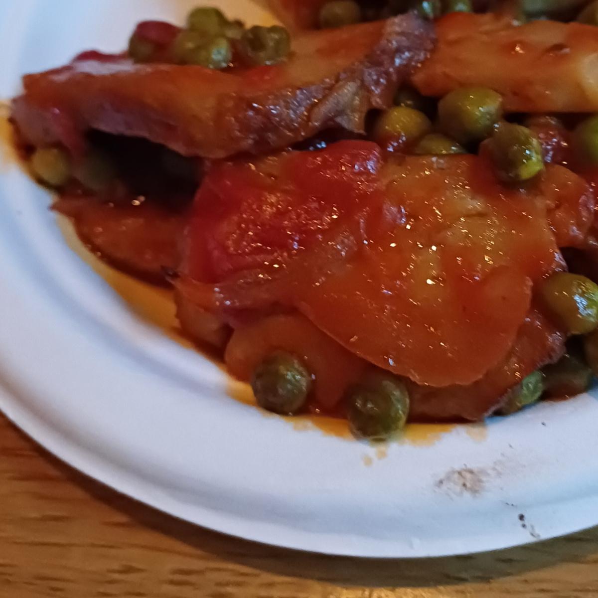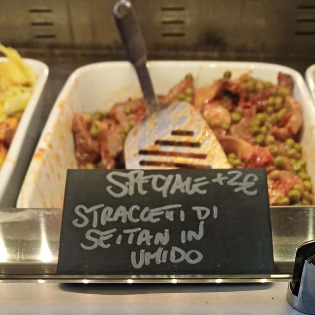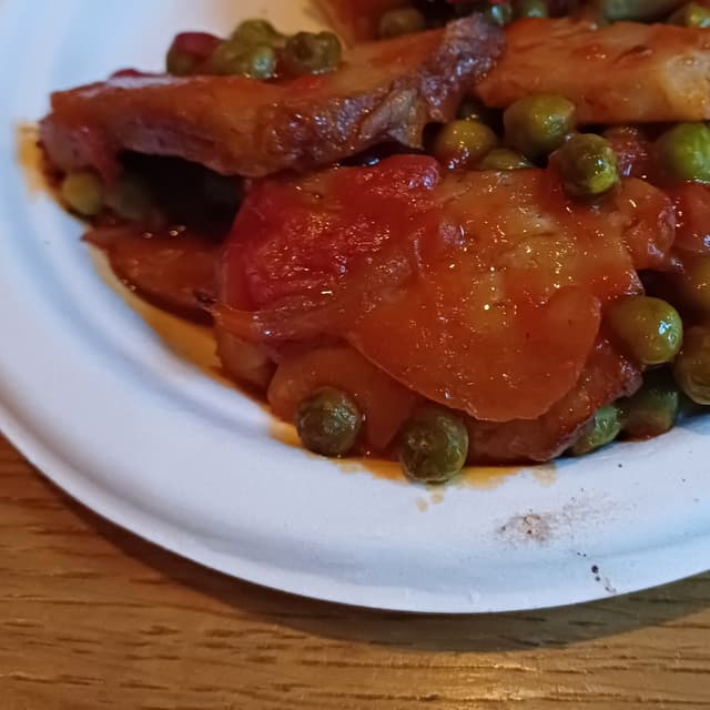 Classici straccetti in umido rivisitati con il seitan al posto del povero pollo. Seitan abbondante, morbido e piuttosto buono. Piselli piccolini, ottimi, con tanta salsa dolce di pomodoro.