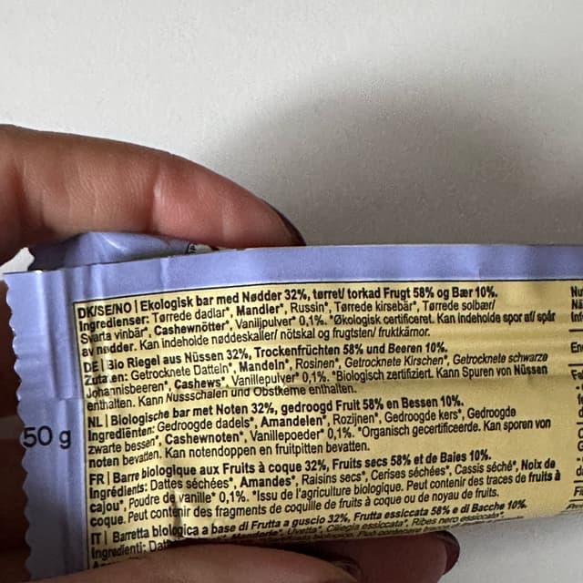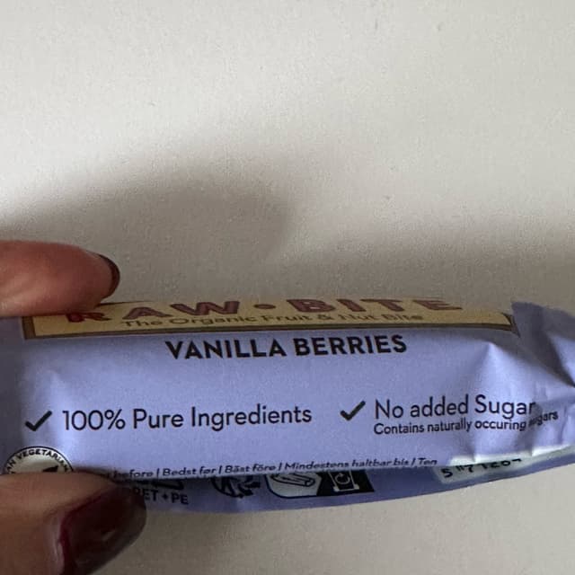 The Raw Bite Vanilla Berries are a nutritious snack made with organic ingredients. This bar is packed with a variety of dried fruits, including dates, raisins, and cherries, as well as almonds and cashews for a satisfying crunch. The vanilla powder adds a subtle, sweet flavor that complements the natural sweetness of the berries. These raw bars are perfect for a midday snack or as a quick, healthy treat. They're made with no added sugars, making them a great option for those watching their sugar intake. The chewy texture and satisfying flavor of the Raw Bite Vanilla Berries make them a favorite snack for many.