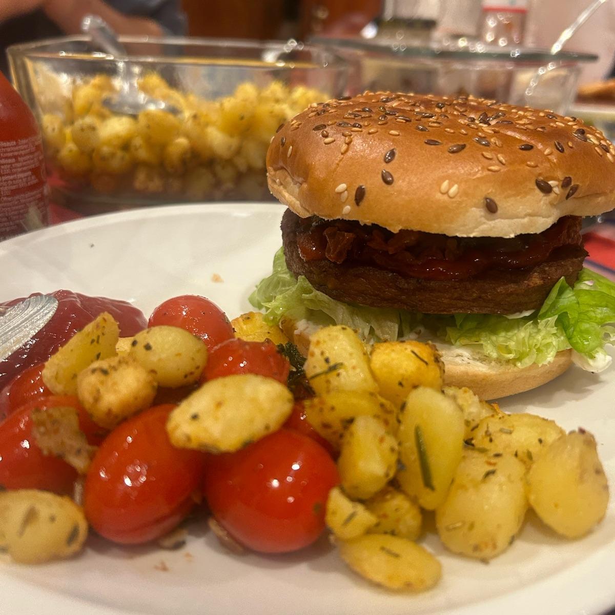 This was a #bombassburger made by my lovely partner Yonas:) Loads of caramelized onions, pickled onions, sauces and lettuce with a really nice meaty patty! It had a great texture and taste, and it has a nutrition score of A! Super quick and easy to make and so delicious. #veganburger #hotmess