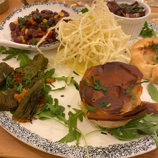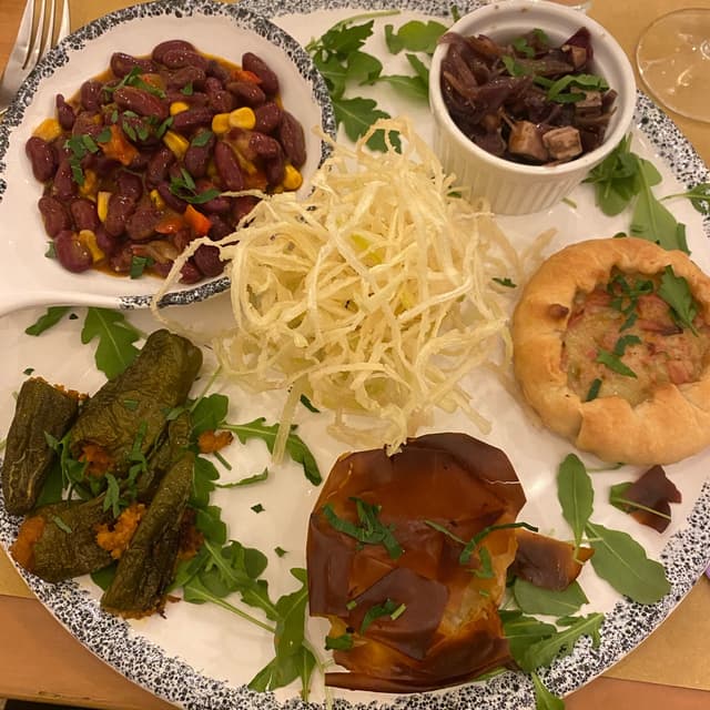 In senso orario: fagioli rossi stufati, tofu con cipolle caramellate, quiche di verdure, sformato di pastafillo ripieno di funghi, friarielli ripieni e julienne di patate fritte. Un piatto con pietanzale ben cucinate e molto sfiziose. Il circolo è caratterizzato da un ambiente informale e casalingo, servizio cordiale e alla mano.