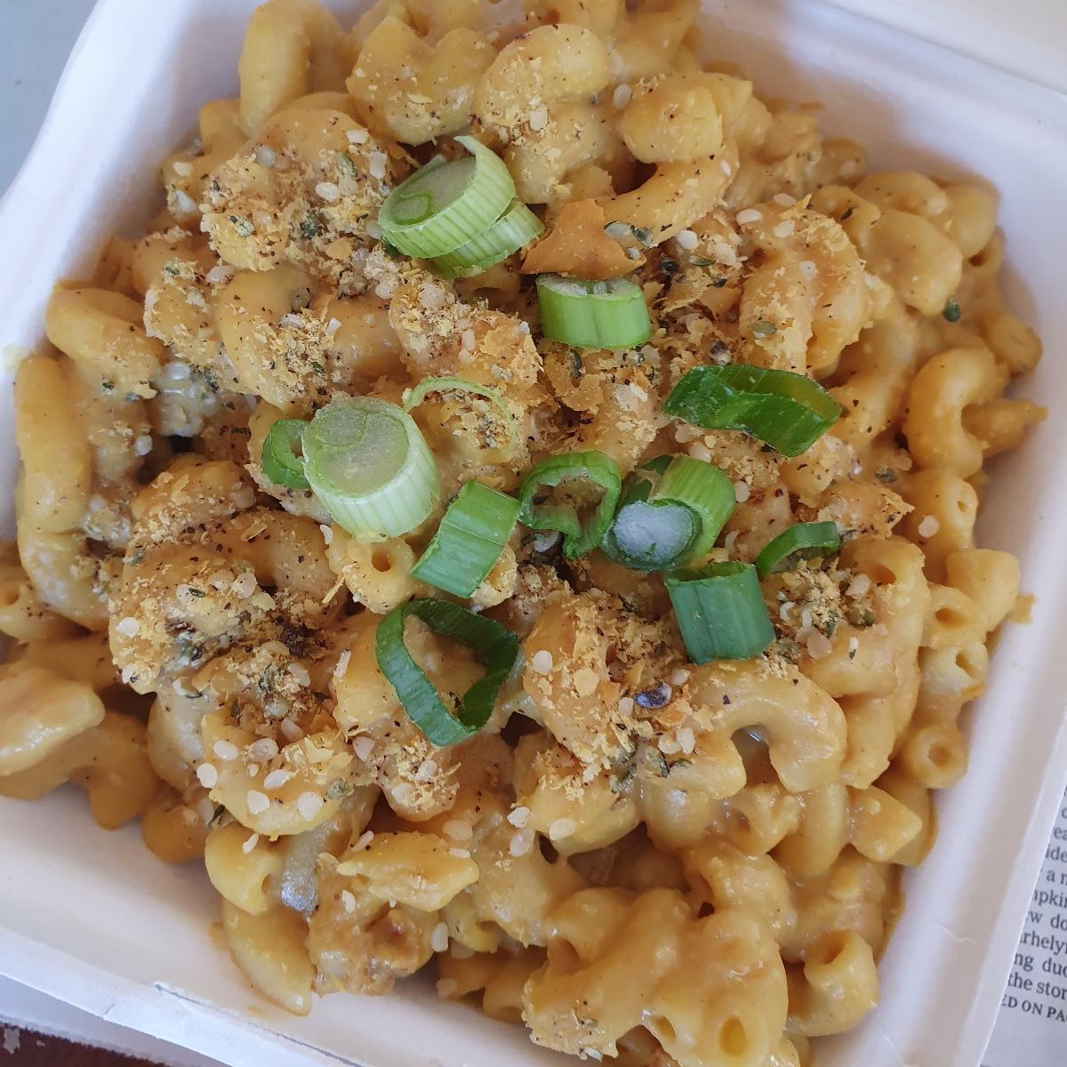 It has #macaroni #pasta with #cashewcheese, topped with a delightful #nutritionalyeast & #breadcrumbs mixture, and #greenonions