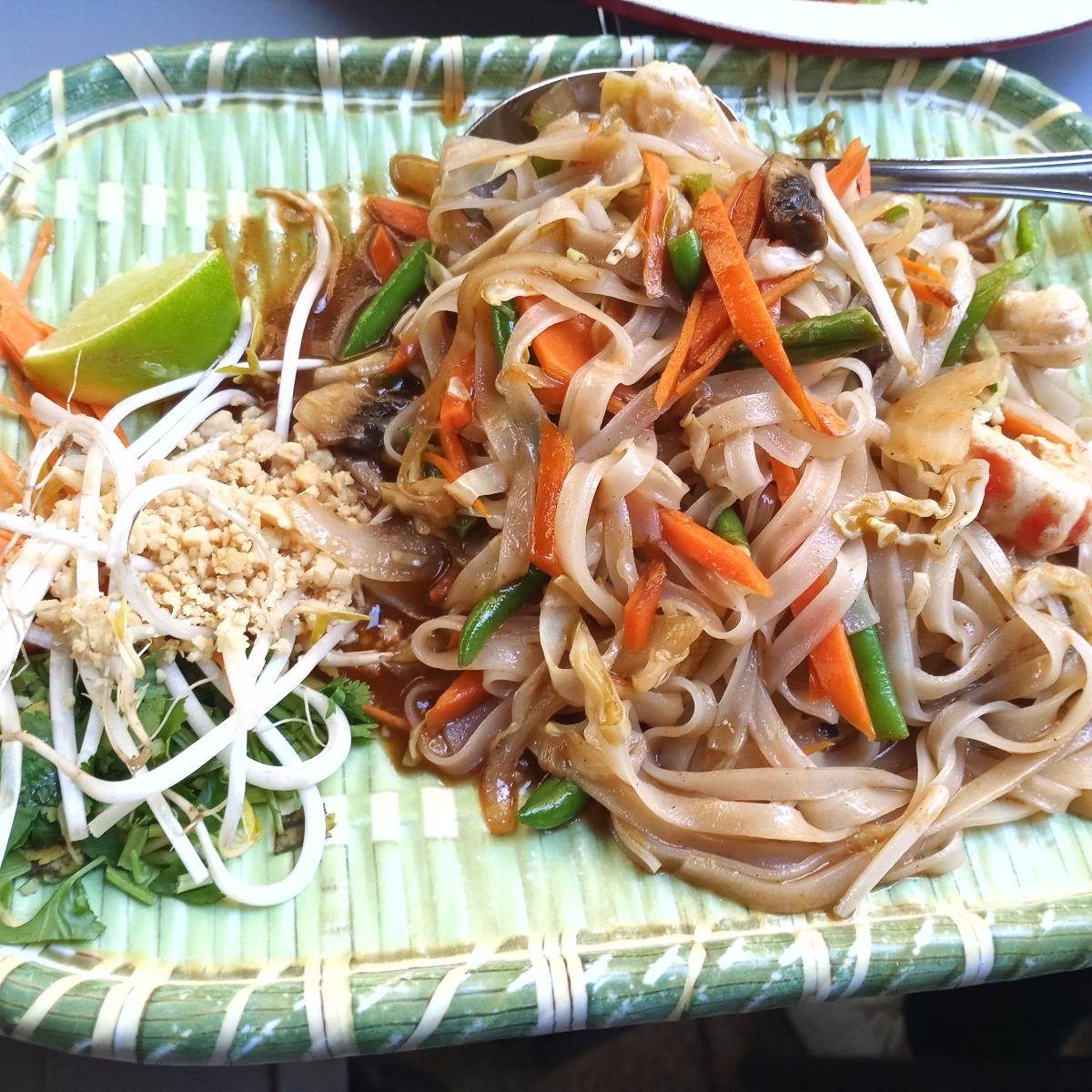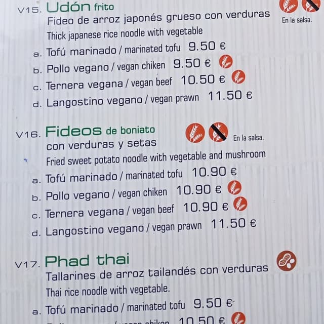 Fideos de arroz japonés frito con verduras y langostinos veganos. Muy bien presentado y sabroso. Pedimos varios principales para compartir, cuando me quise dar cuenta ya no quedaba ni un vega-langostino, así que no los puede probar, en todo caso significa que estaban muy ricos...