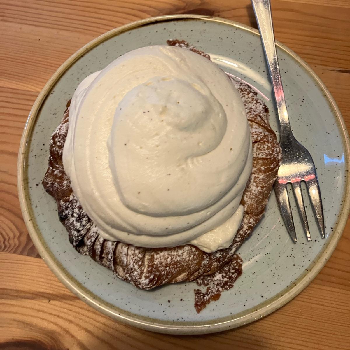 Deliziosa caffetteria 100% vegetale 😍 questo è il dolcetto autunnale, con mele e panna montata. L'ho trovato un po' dolce per i miei gusti e un po' troppo pannoso, ma comunque buono, da prendere se si ha parecchia fame.