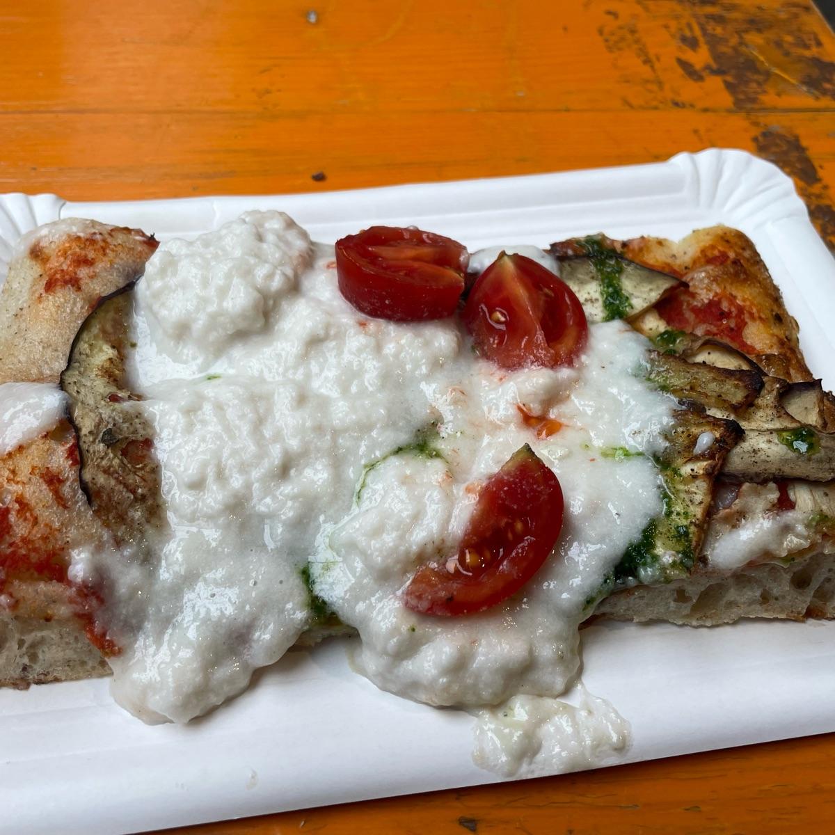 Trancio di pizza molto buono, anche se inizialmente non ho apprezzato molto il contrasto tra il caldo della pizza ed il fresco dea stracciatella.